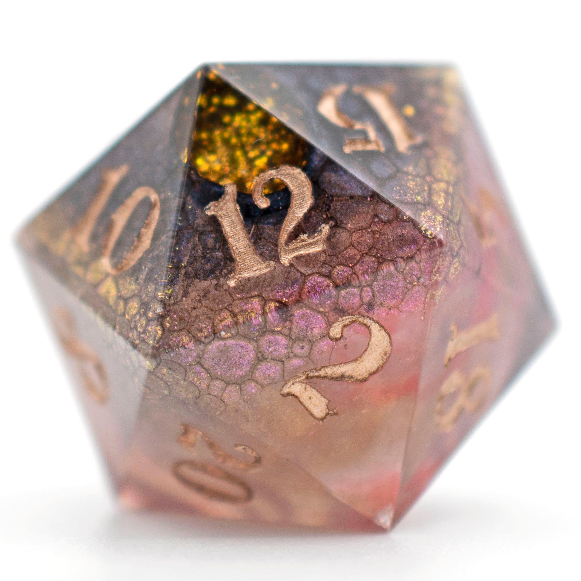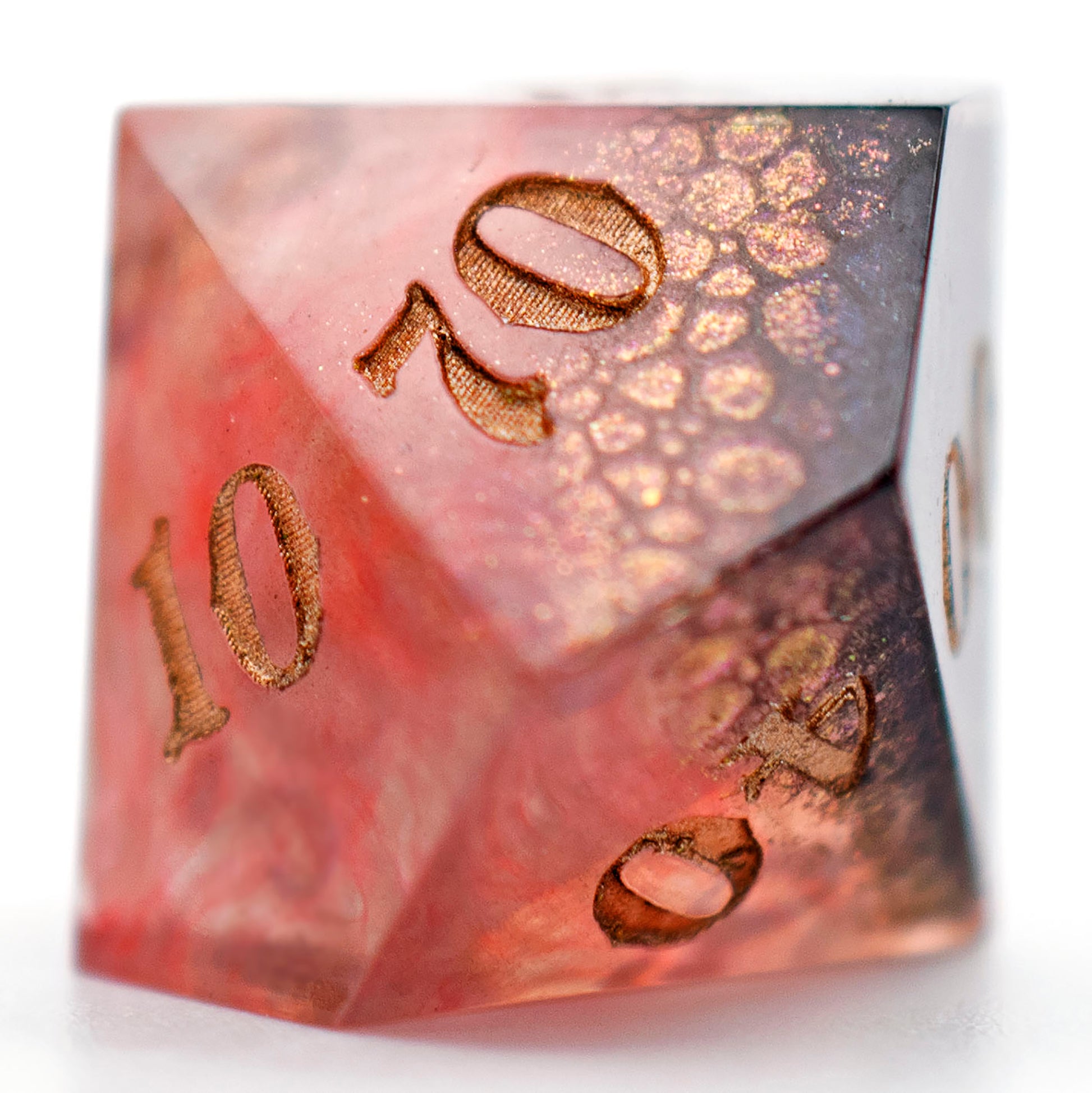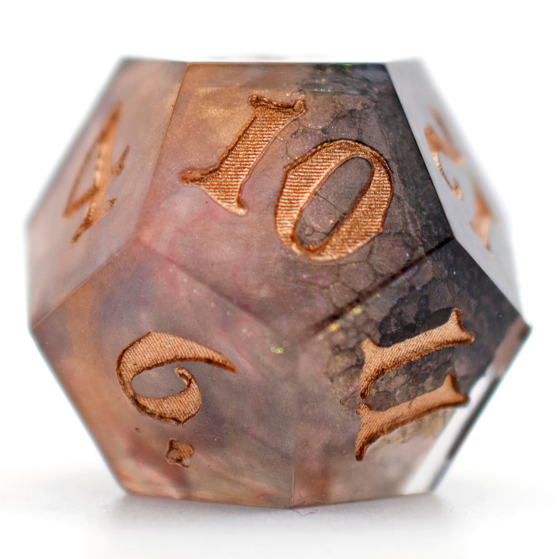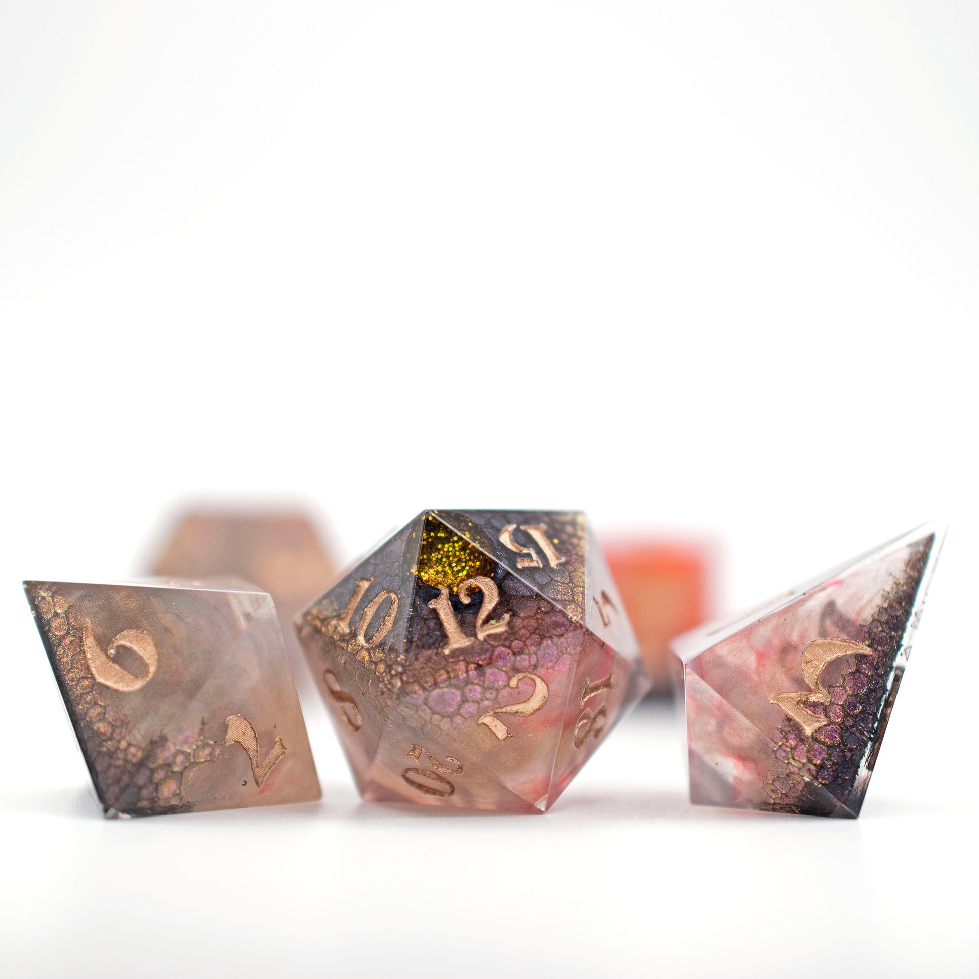 These dice have cores of pink and champagne colors, the d20 has a cove of gold, patches of dragon scale pattern on the outside of the core shimmer a black and iridescent pink hue. These dice would be great for a draconic bloodline sorcerer or a dragonborn character.