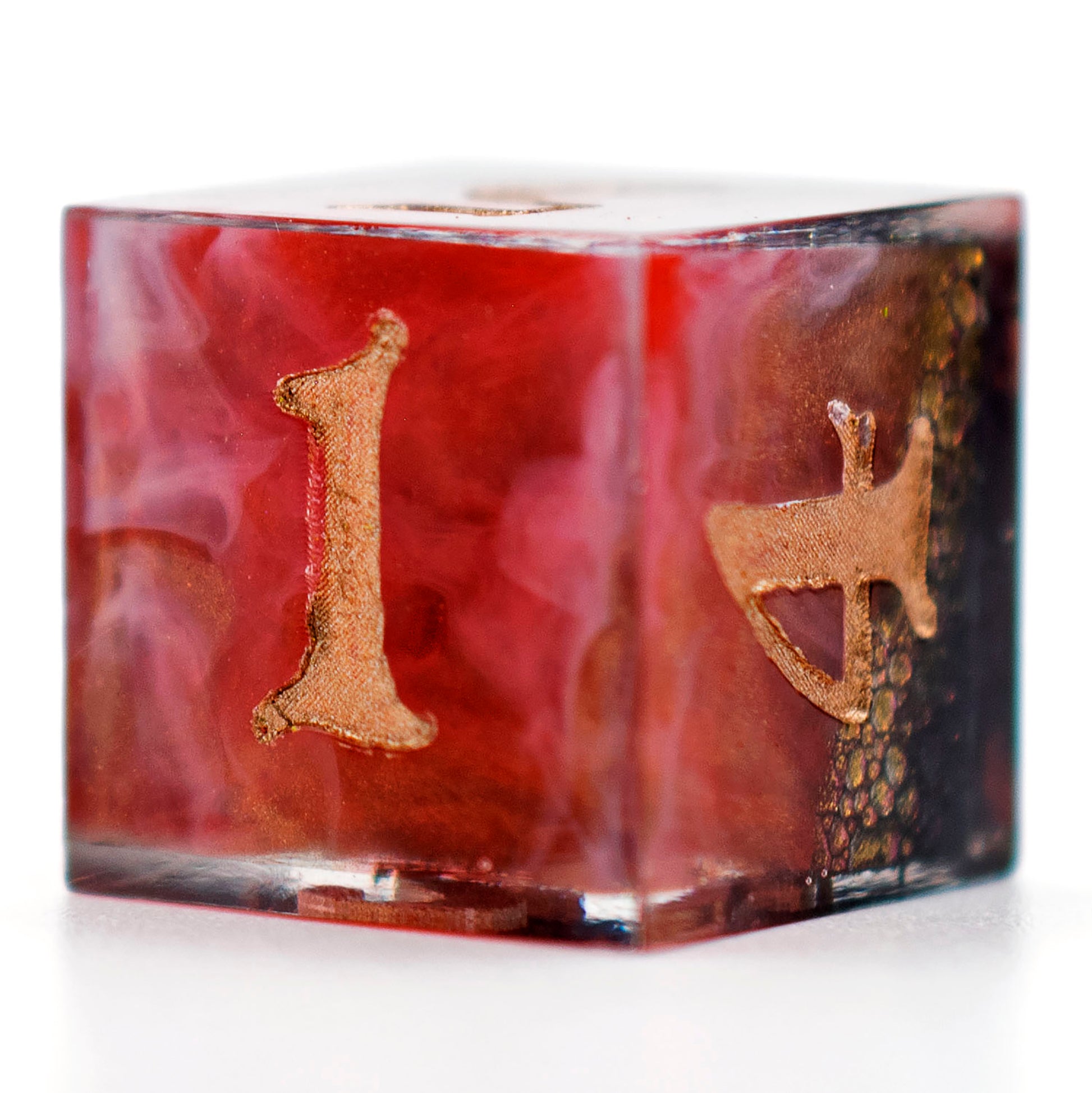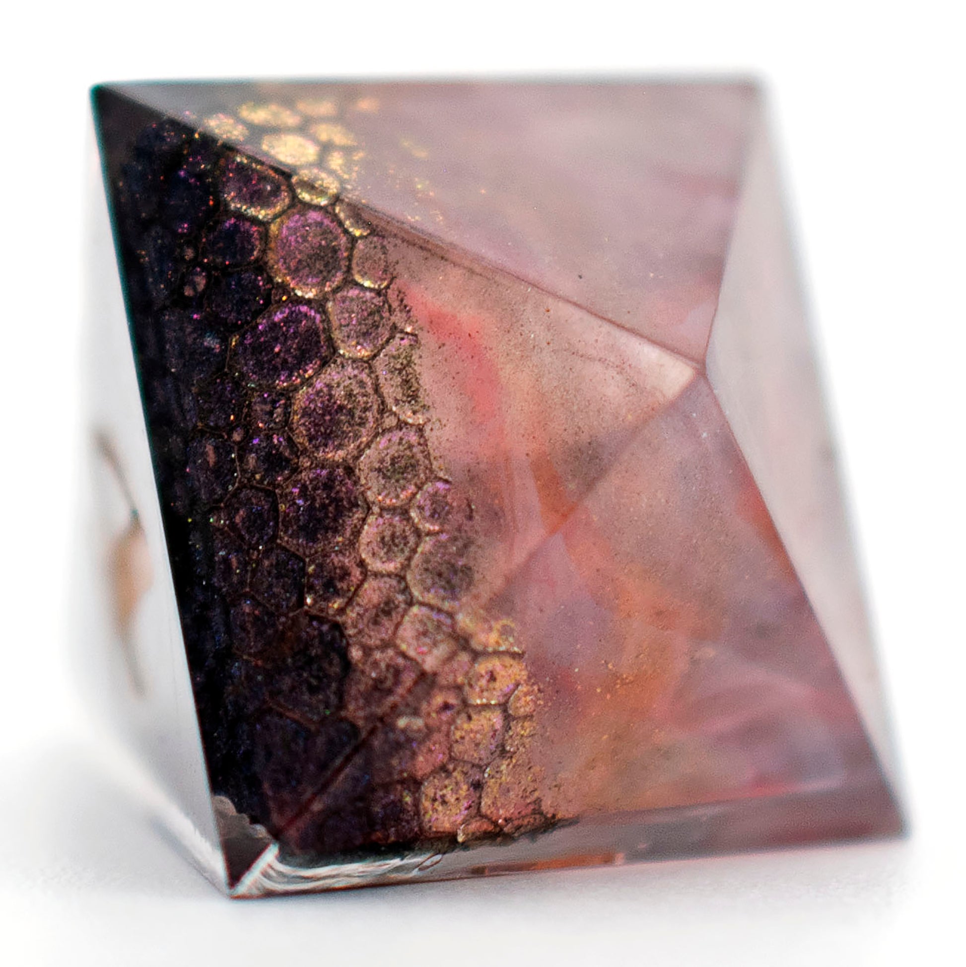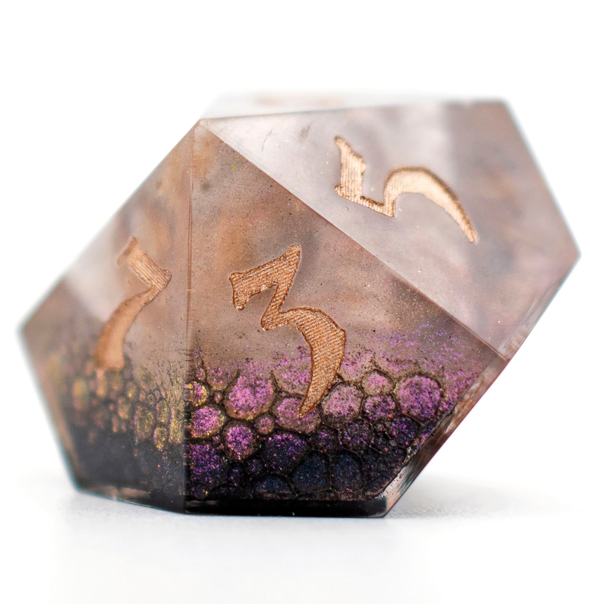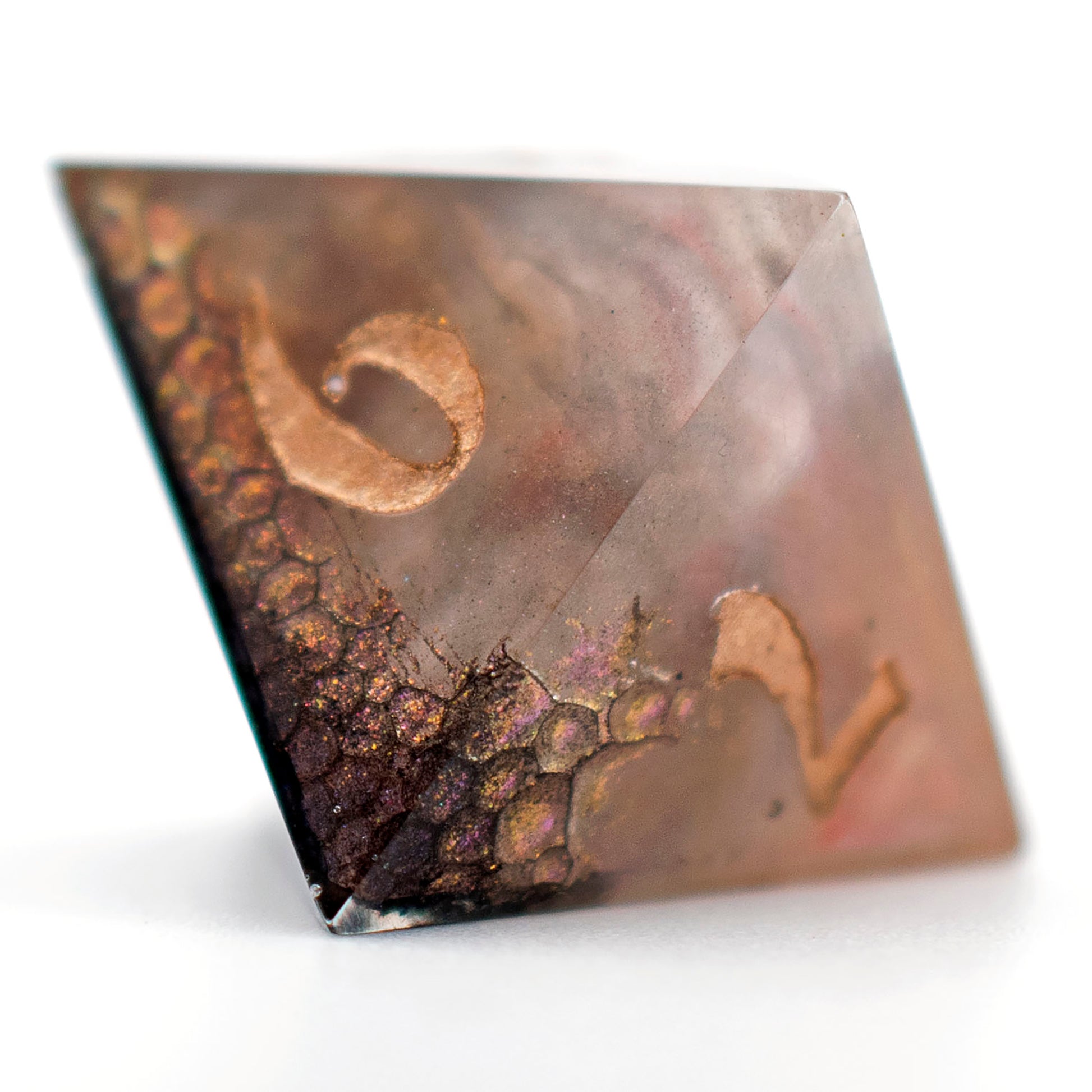 These dice have cores of pink and champagne colors, the d20 has a cove of gold, patches of dragon scale pattern on the outside of the core shimmer a black and iridescent pink hue. These dice would be great for a draconic bloodline sorcerer or a dragonborn character.