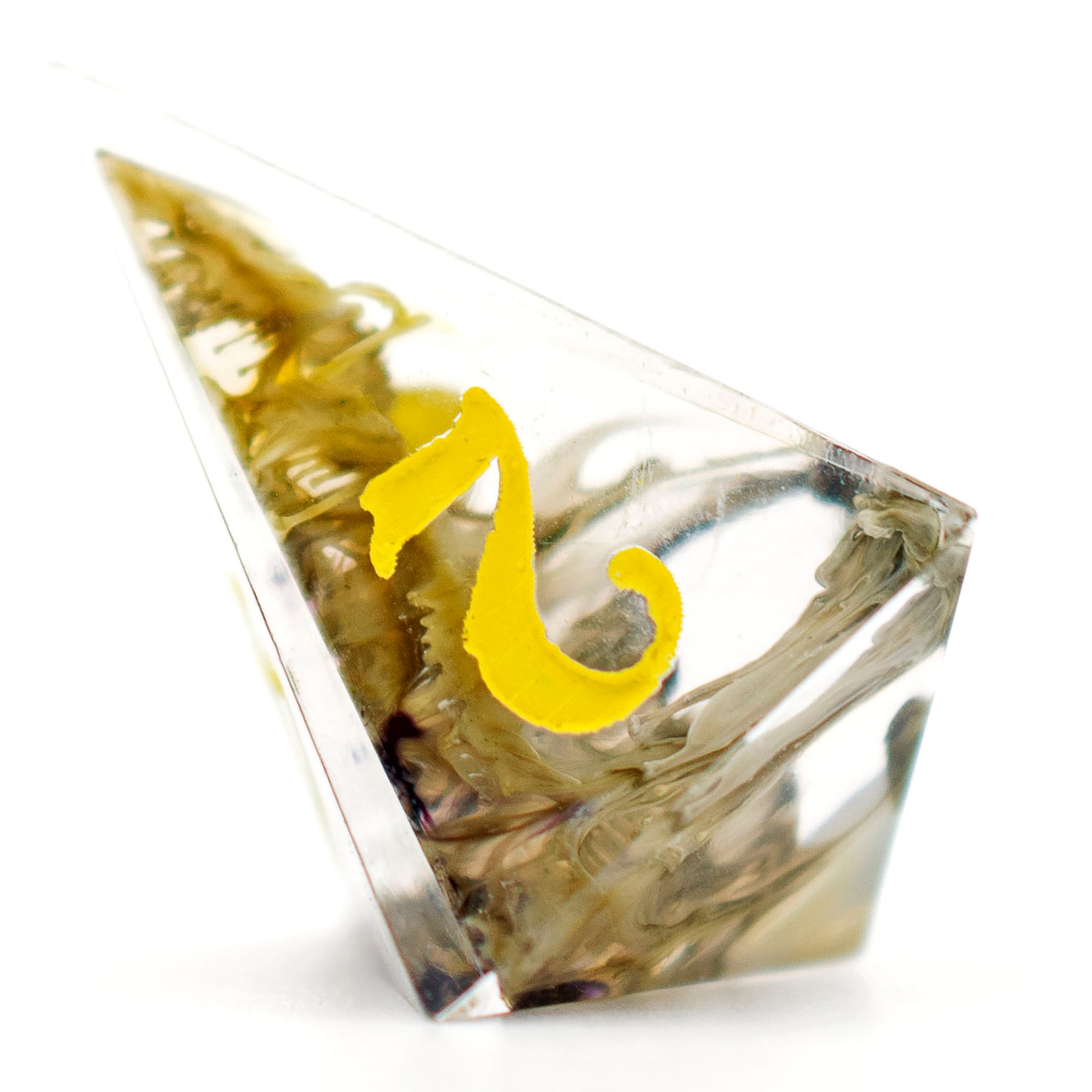 Dark purple spores sprout from the bottom of these dice, mingling with the yellow inked numbers.