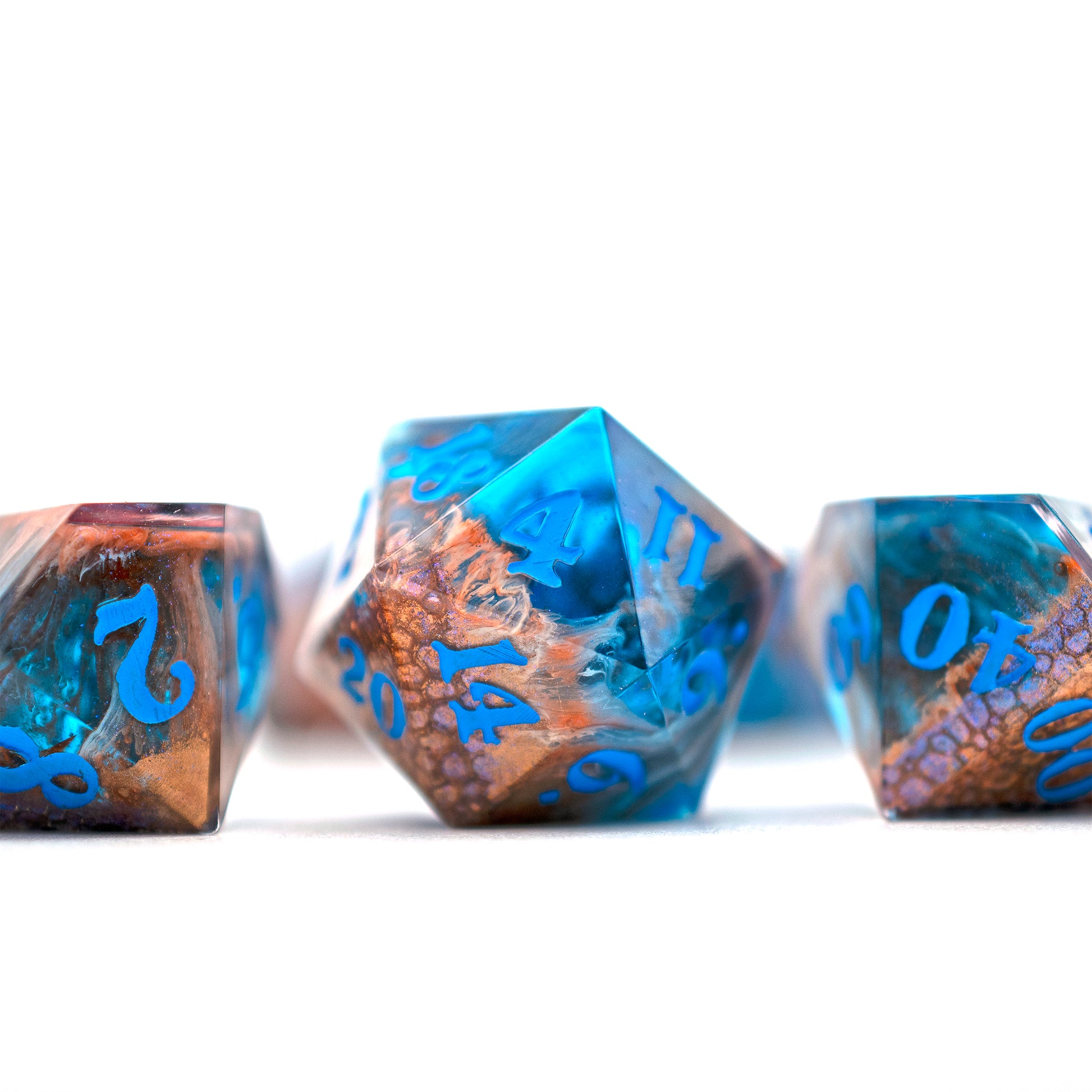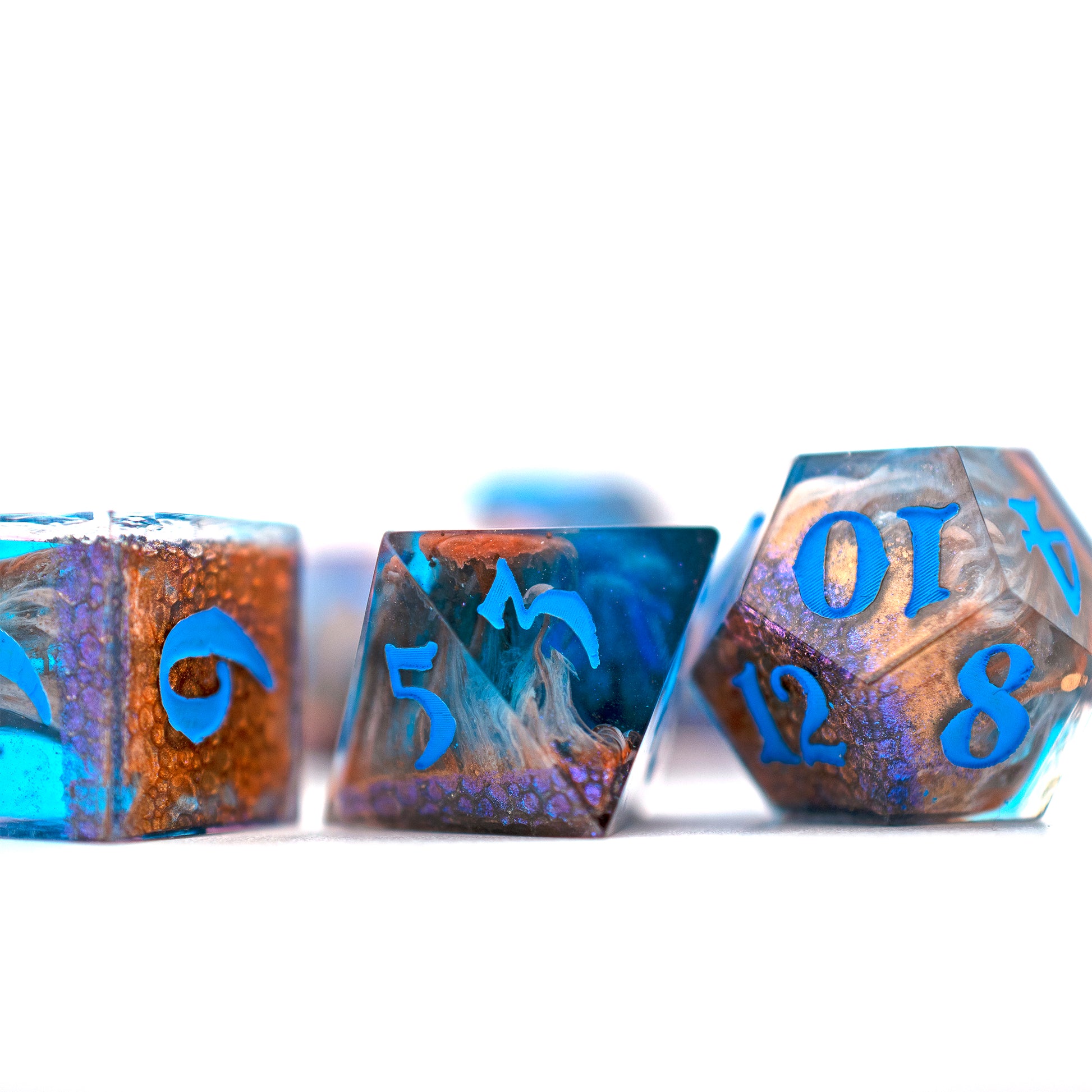 Each set of dice are handcrafted: cast in resin, sanded, painted, and polished to a gleam. This means each set is unique, and may have minor cosmetic imperfections that won’t impact their functionality. We will not accept any returns due to these imperfections. This set of dice consists of 7 pieces, one of each of the following: D20, D12, D10, D%, D8, D6, D4.