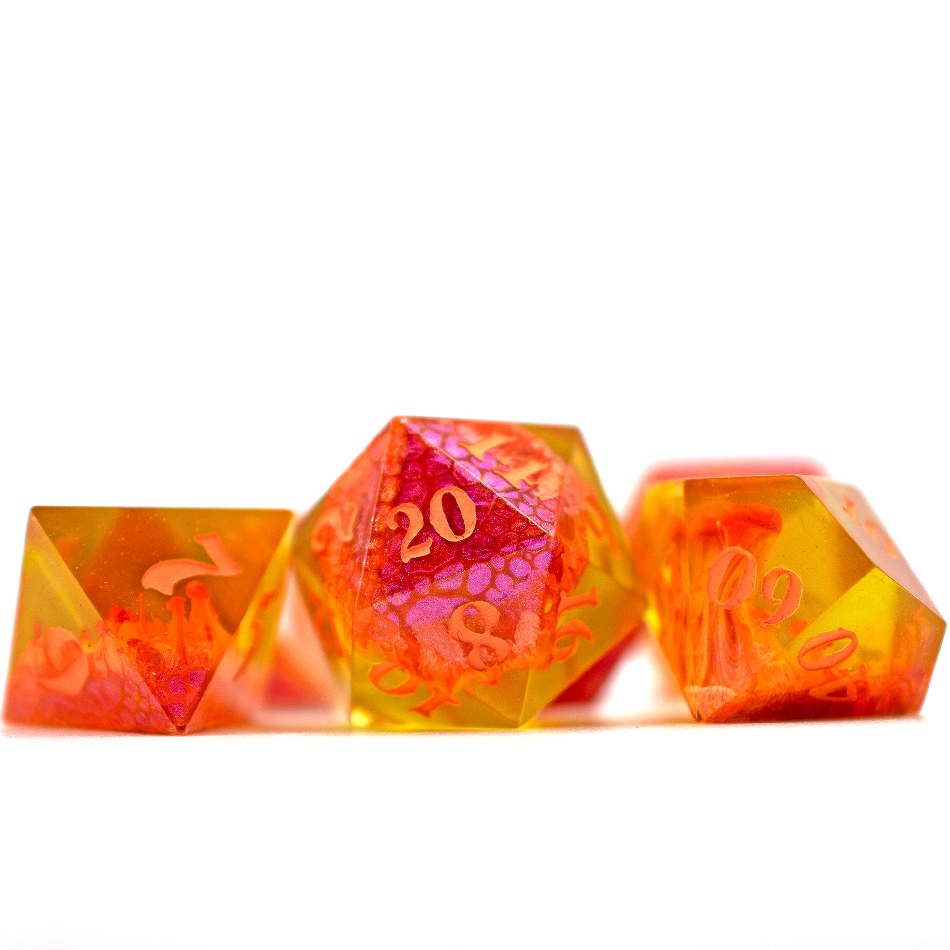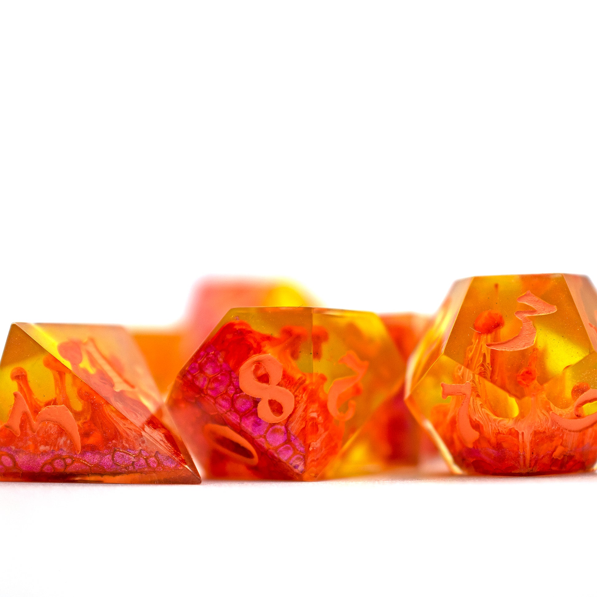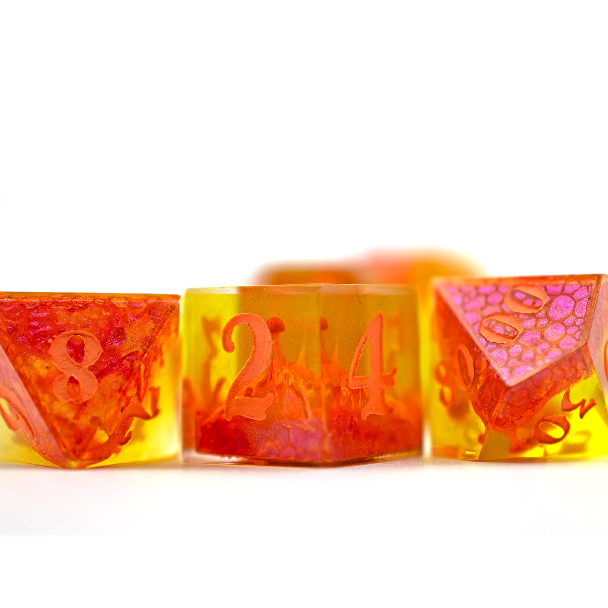 Each set of dice are handcrafted: cast in resin, sanded, painted, and polished to a gleam. This means each set is unique, and may have minor cosmetic imperfections that won’t impact their functionality. We will not accept any returns due to these imperfections. This set of dice consists of 7 pieces, one of each of the following: D20, D12, D10, D%, D8, D6, D4.