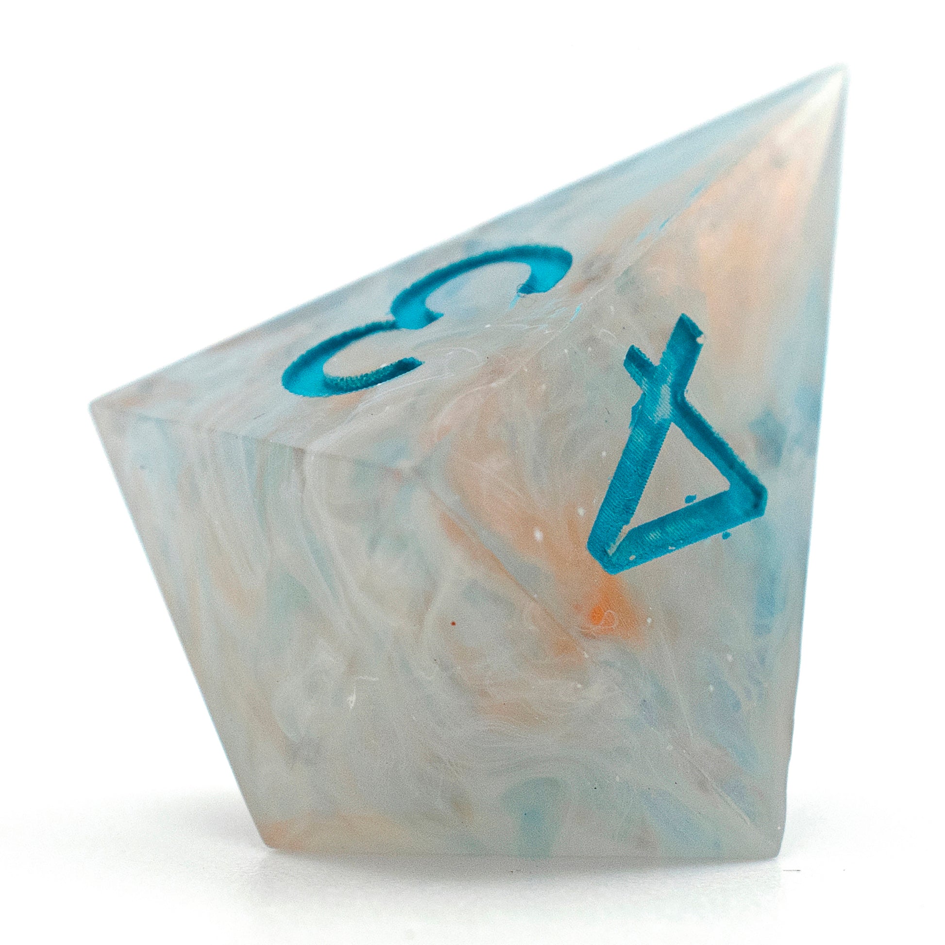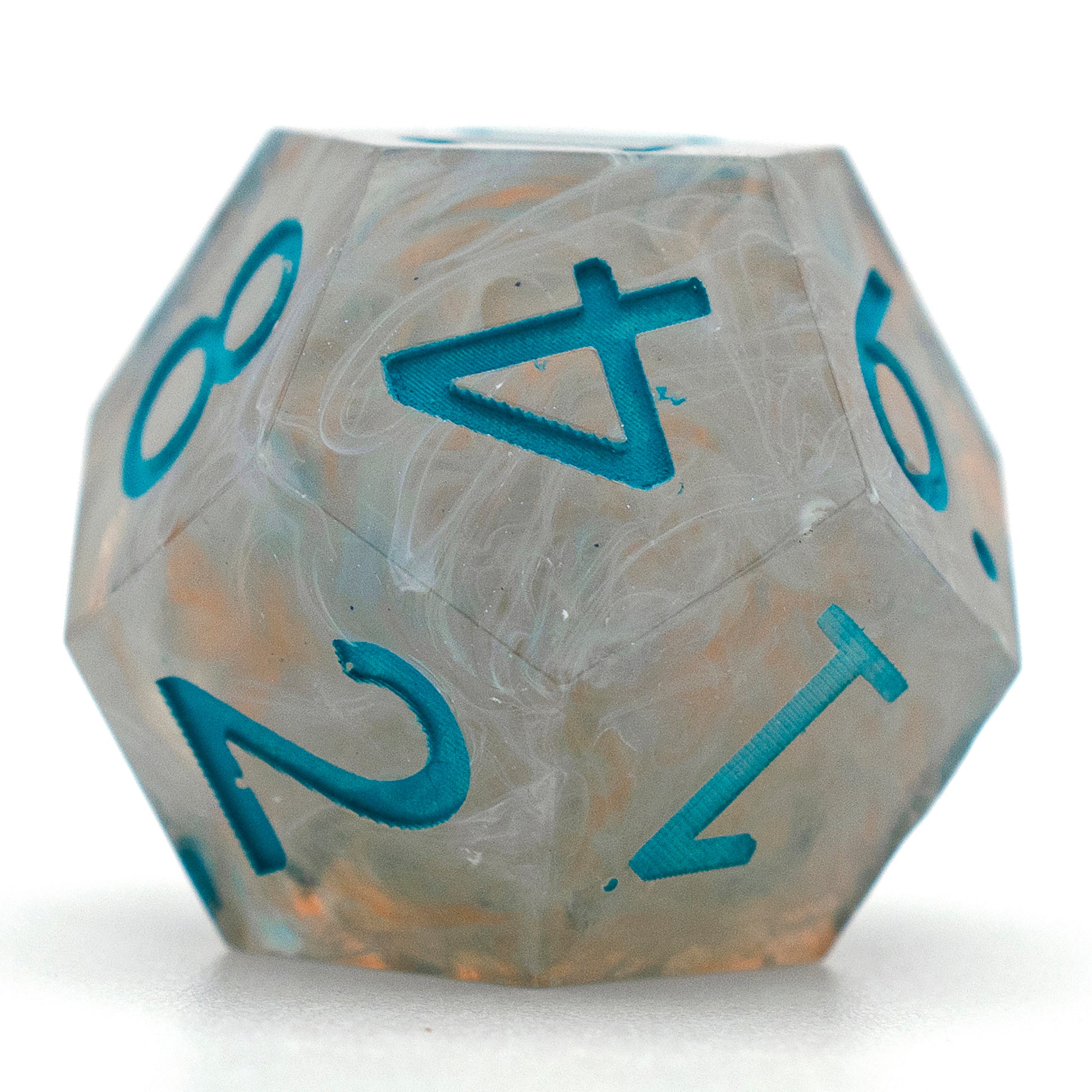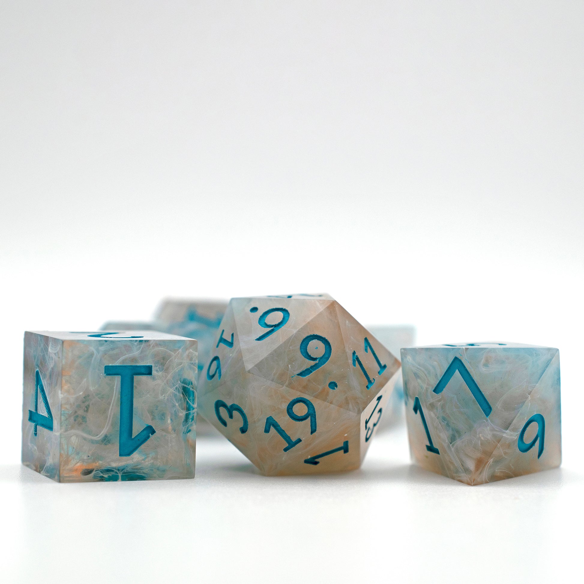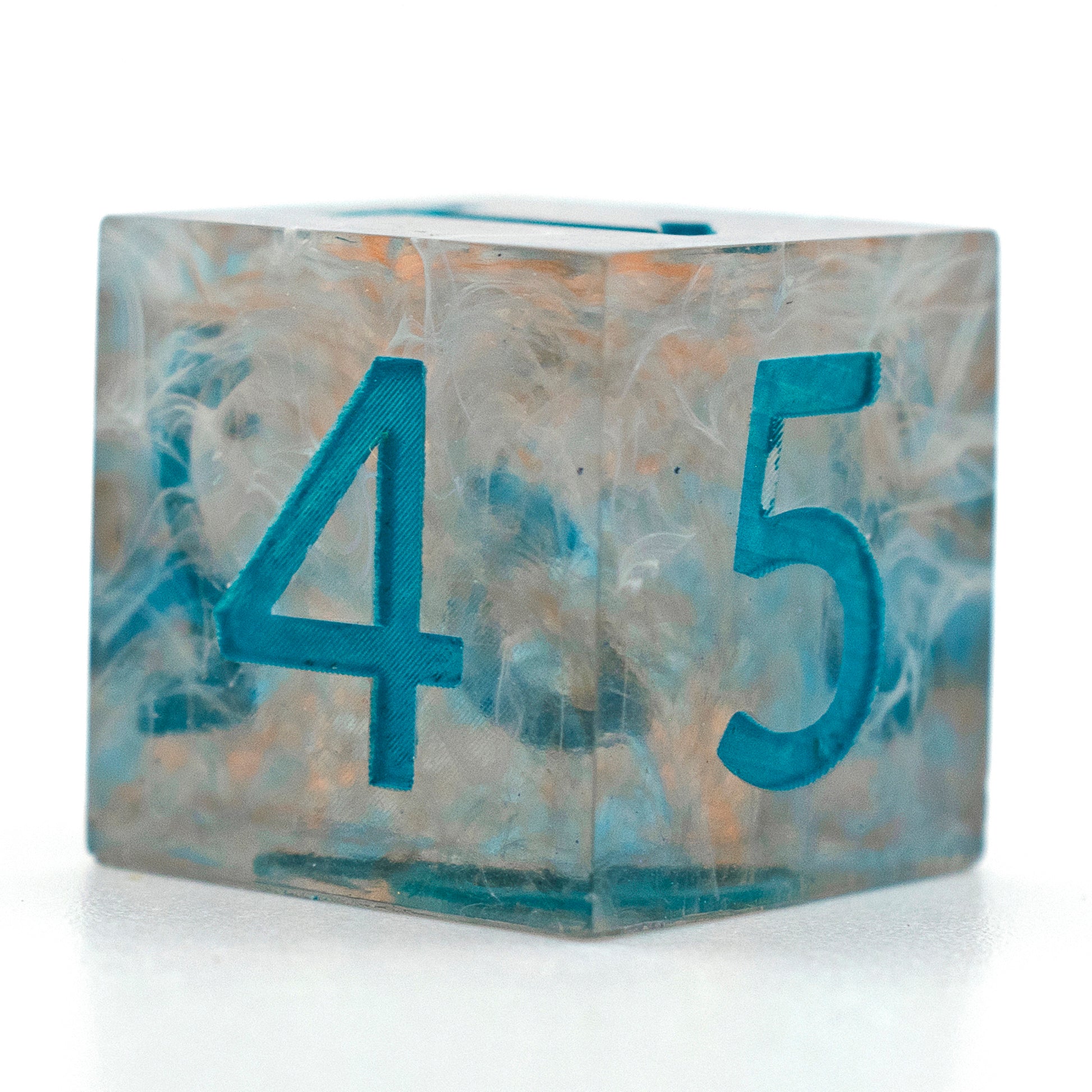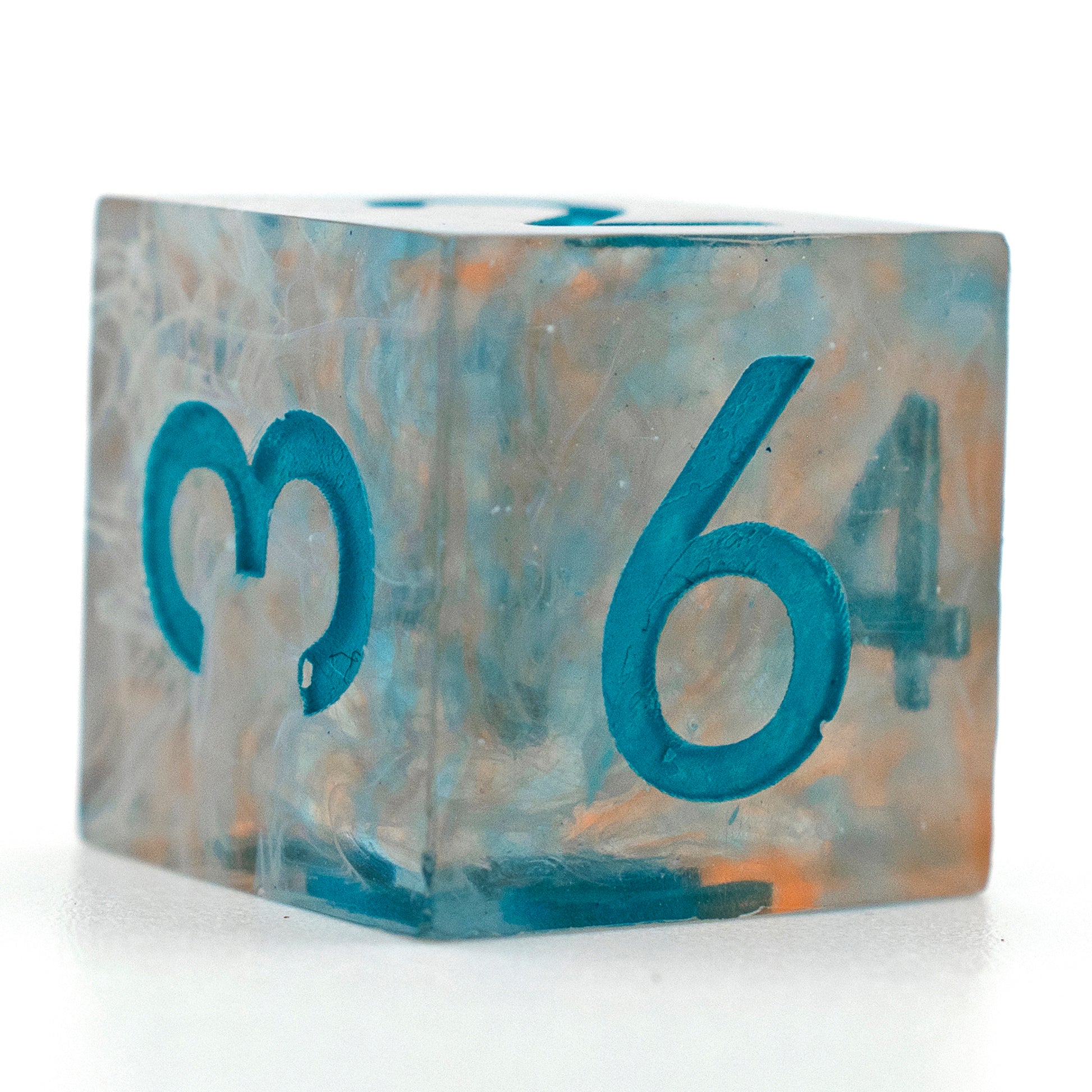 Boast swirls of blue and orange resin, these dice are imbued with an ethereal quality reminiscent of otherworldly spirits and mysterious energies.