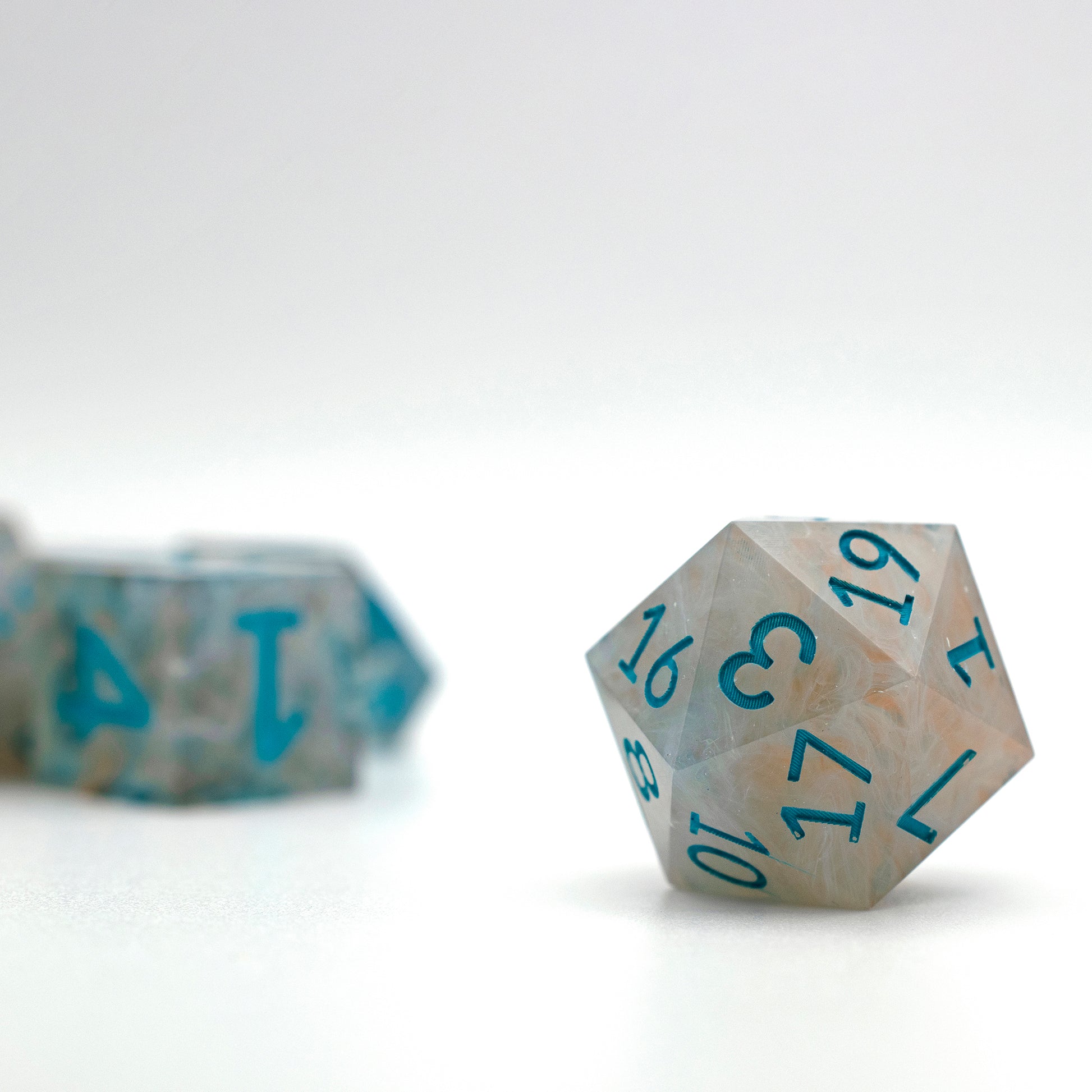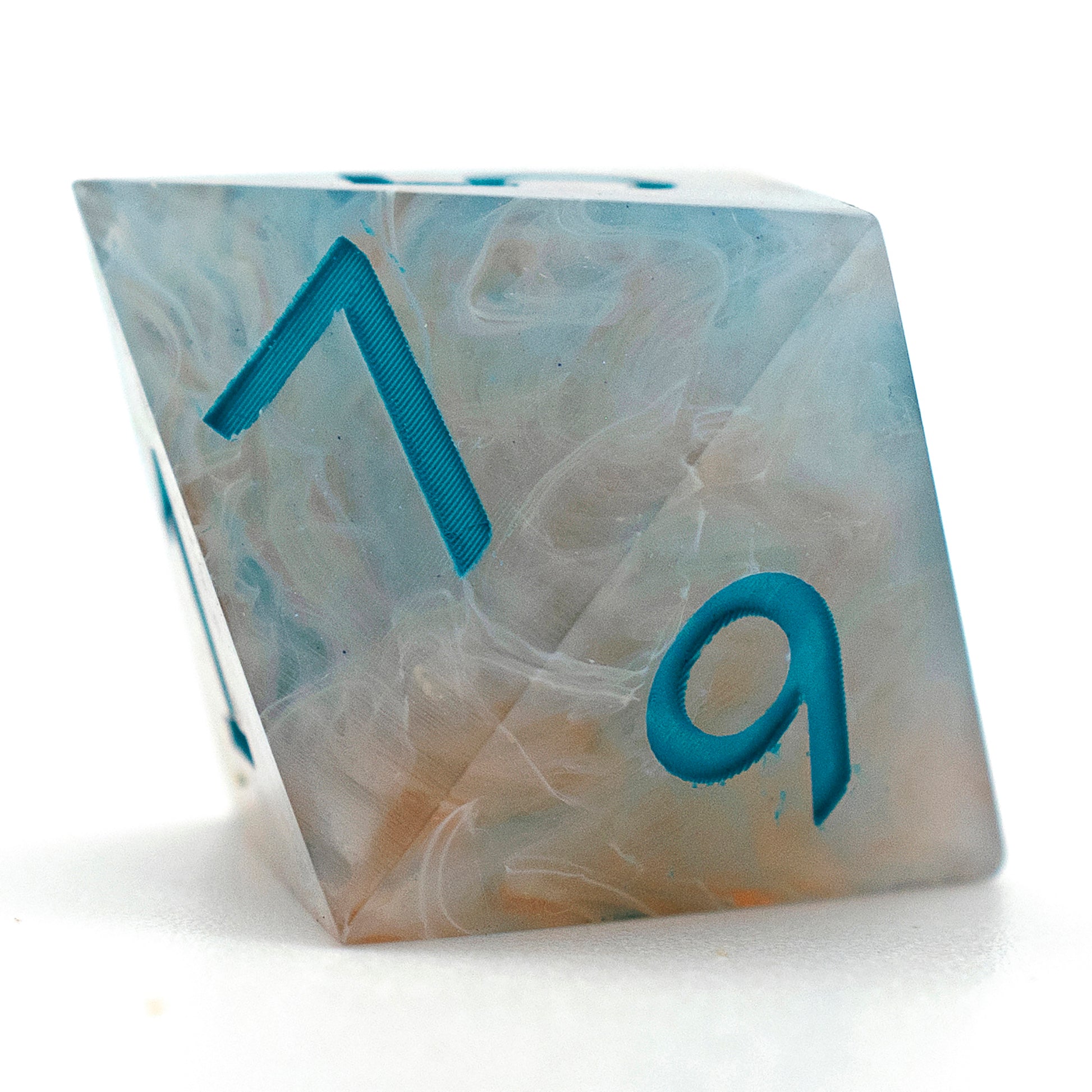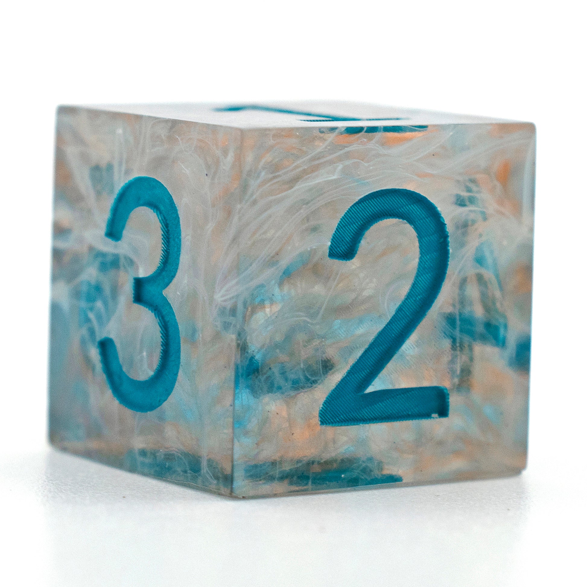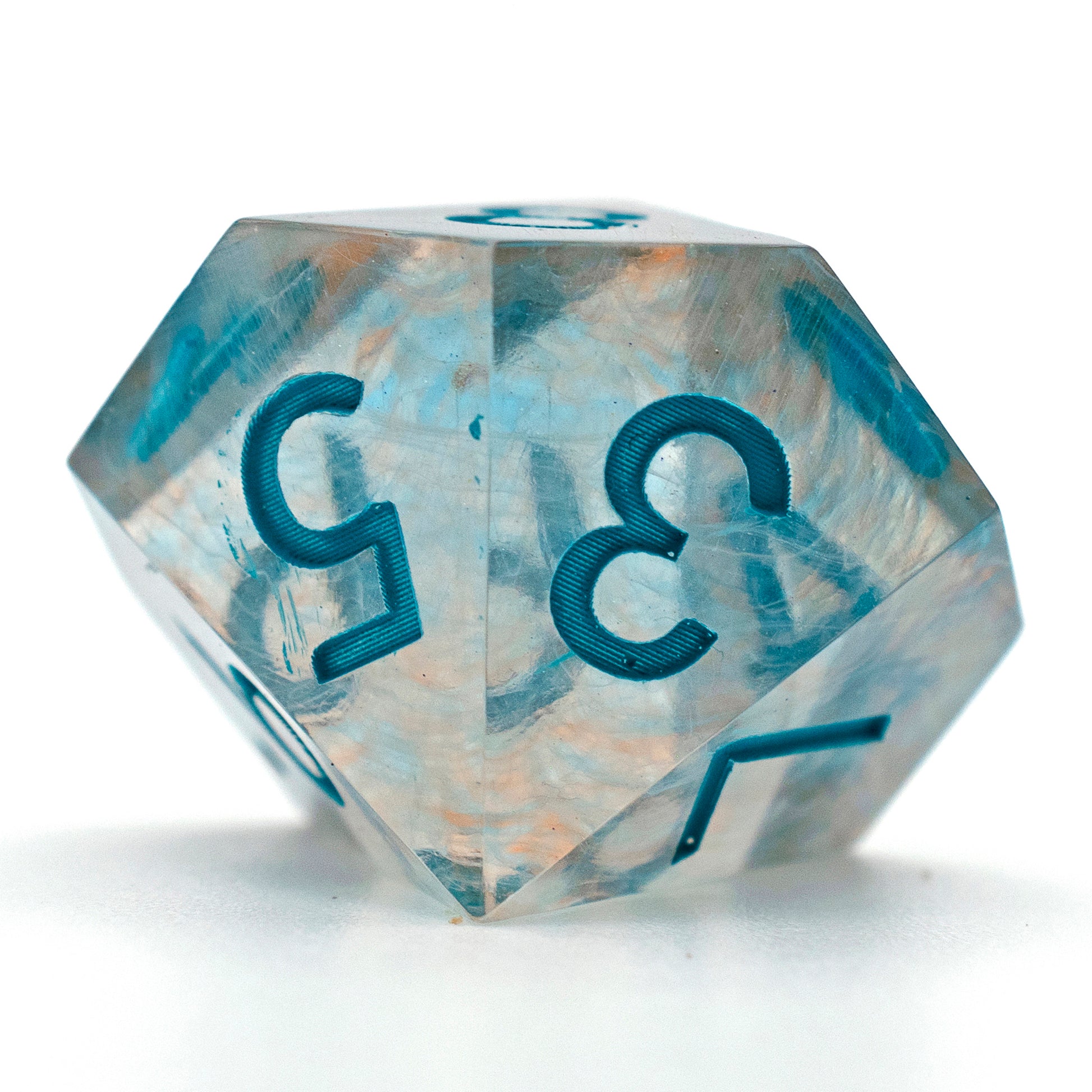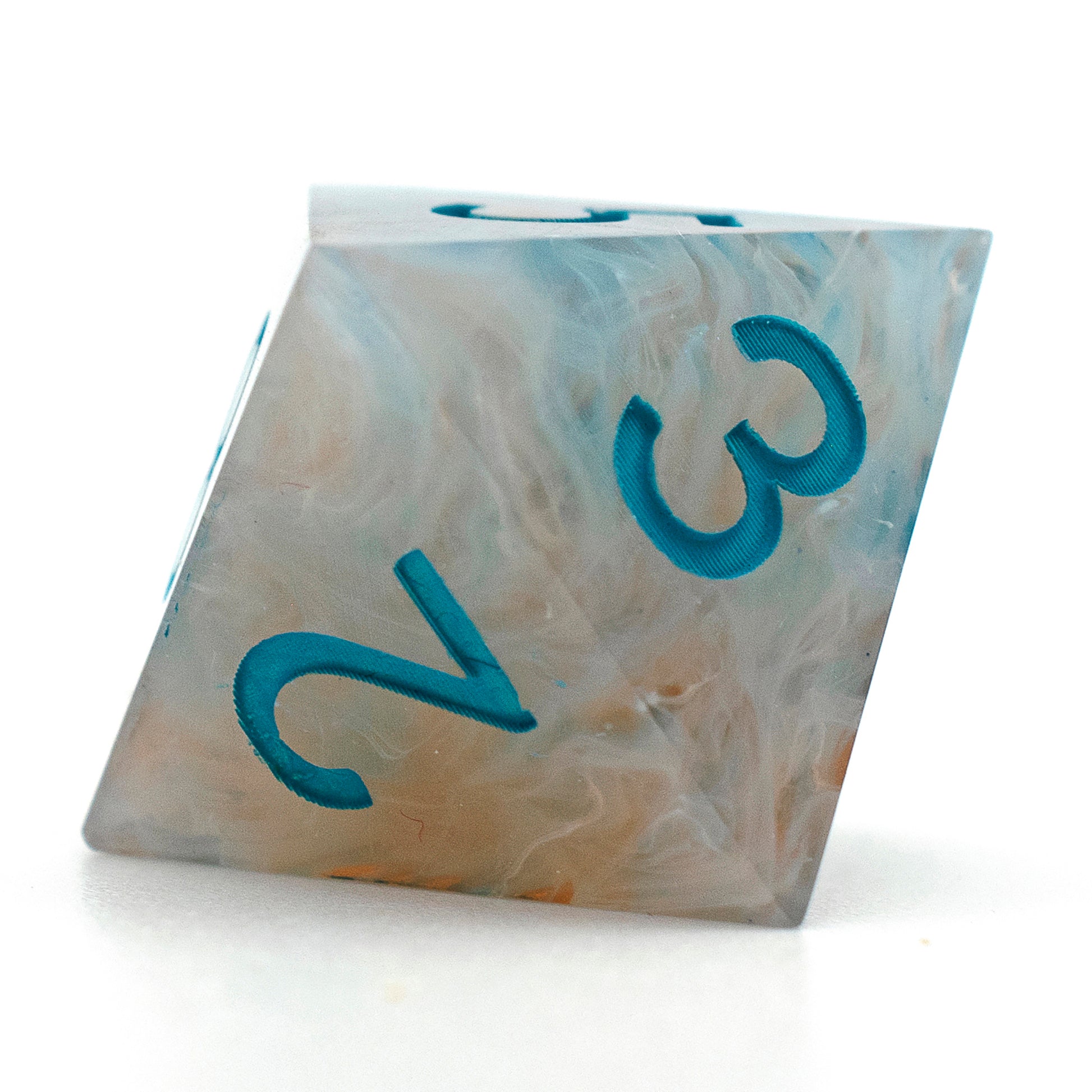 Boast swirls of blue and orange resin, these dice are imbued with an ethereal quality reminiscent of otherworldly spirits and mysterious energies.