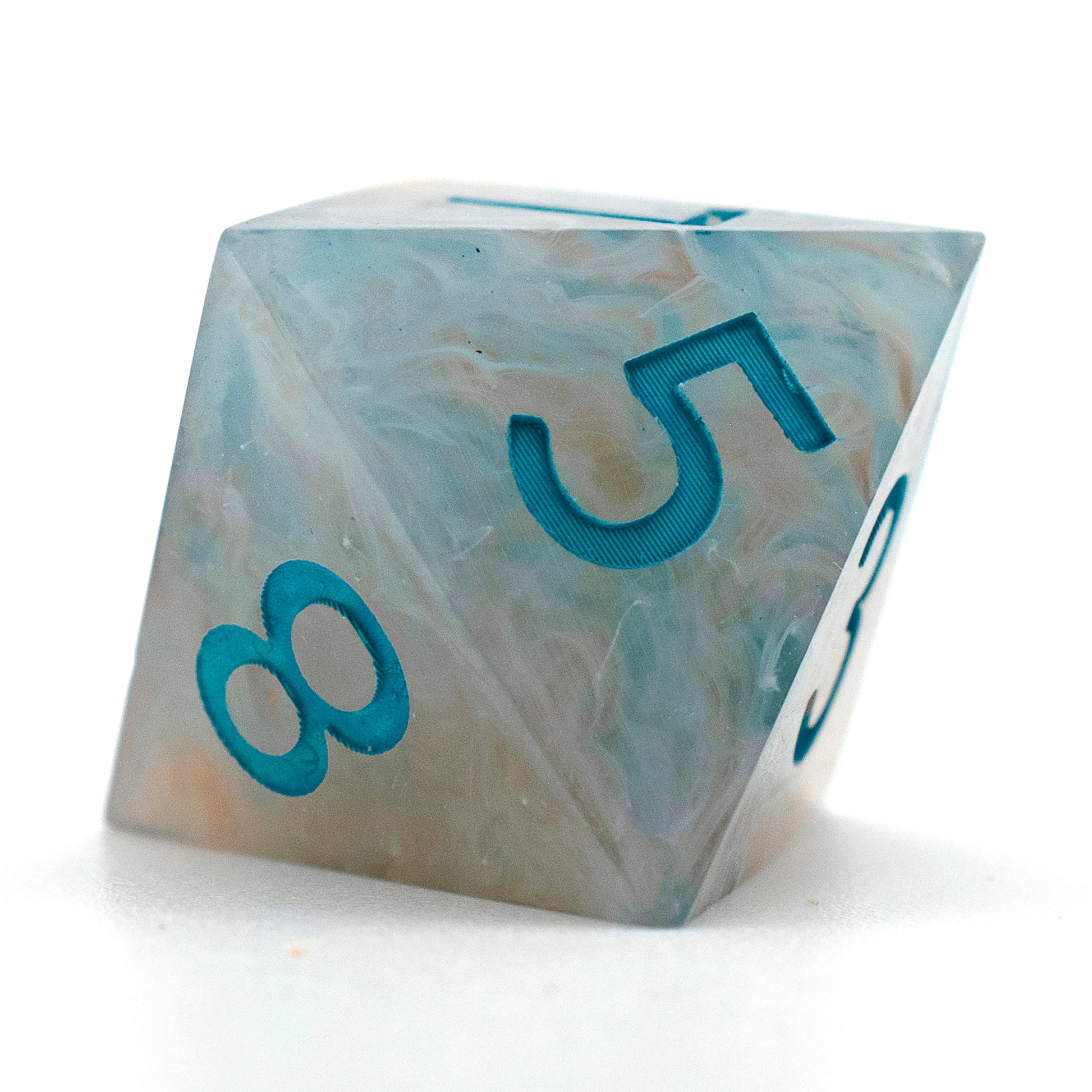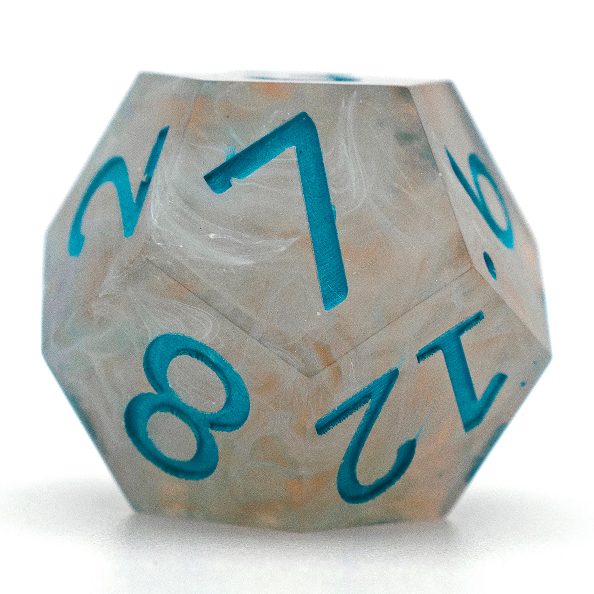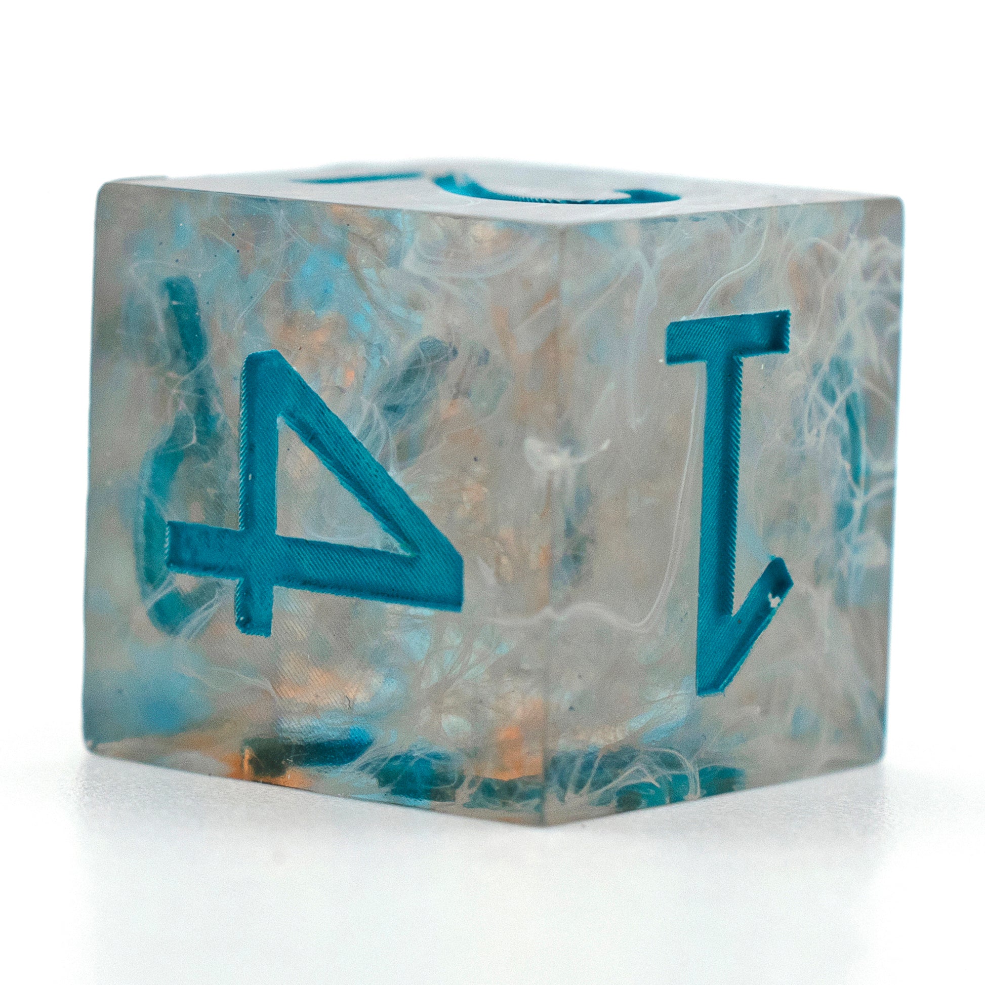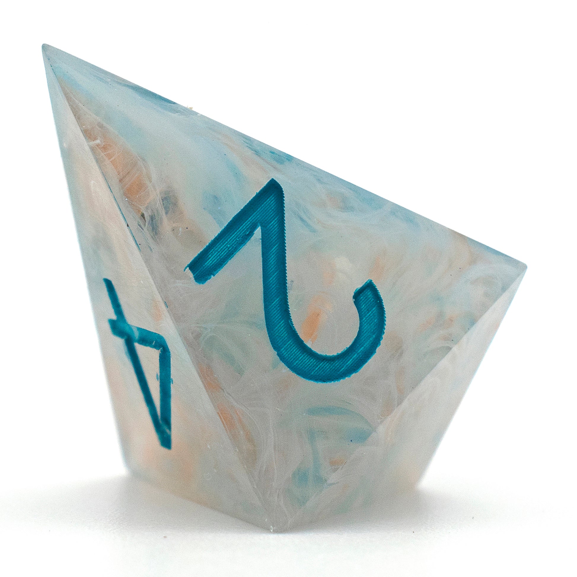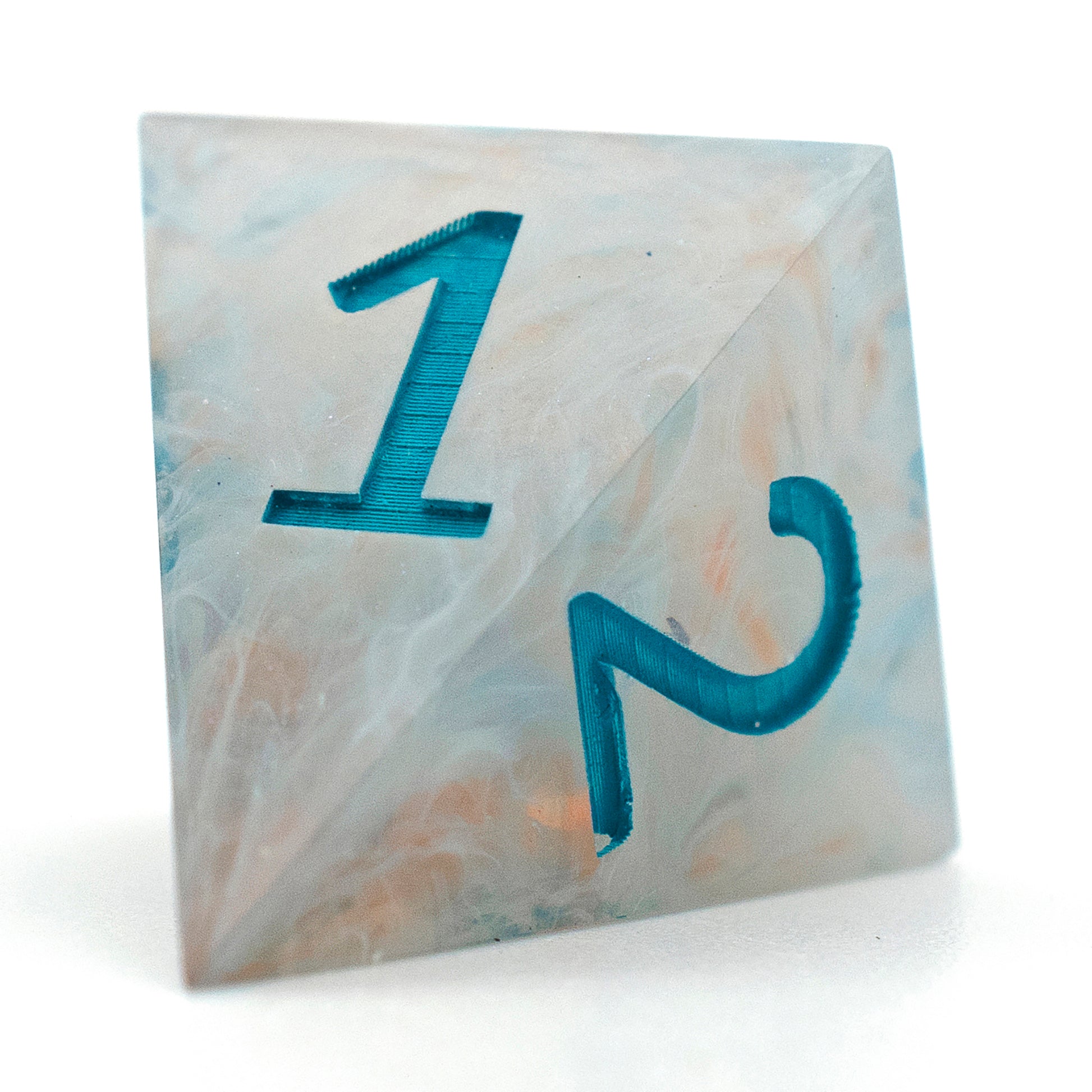 Boast swirls of blue and orange resin, these dice are imbued with an ethereal quality reminiscent of otherworldly spirits and mysterious energies.