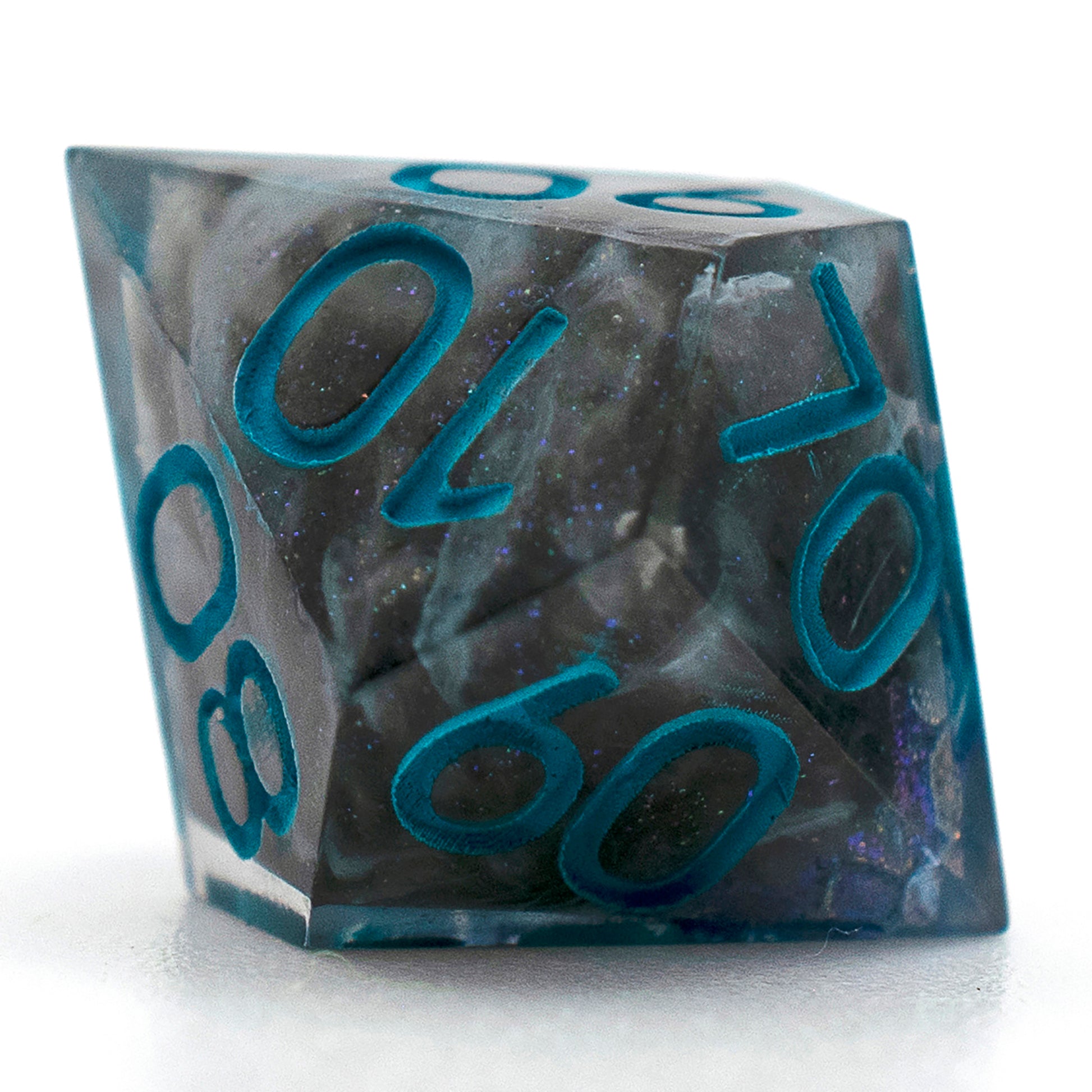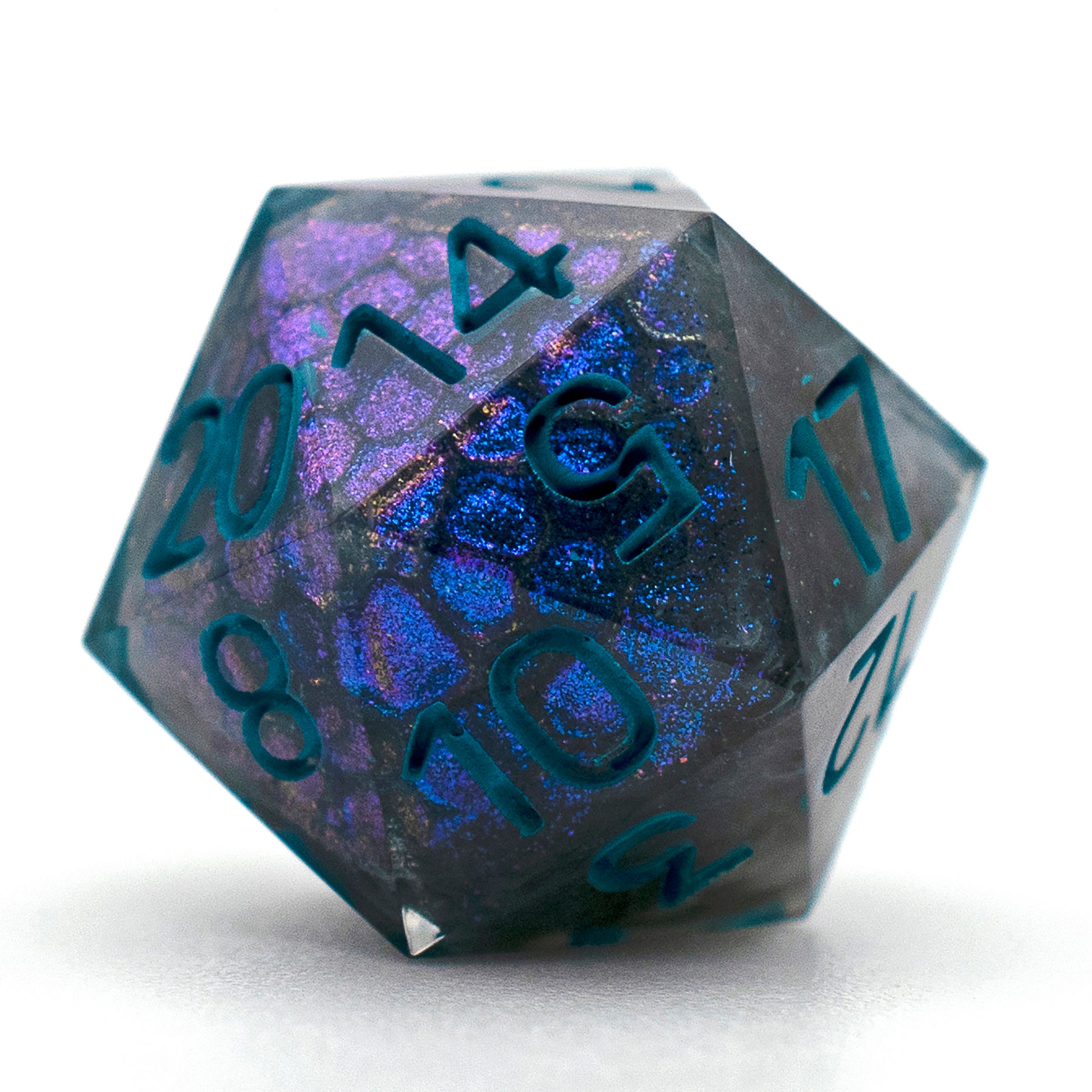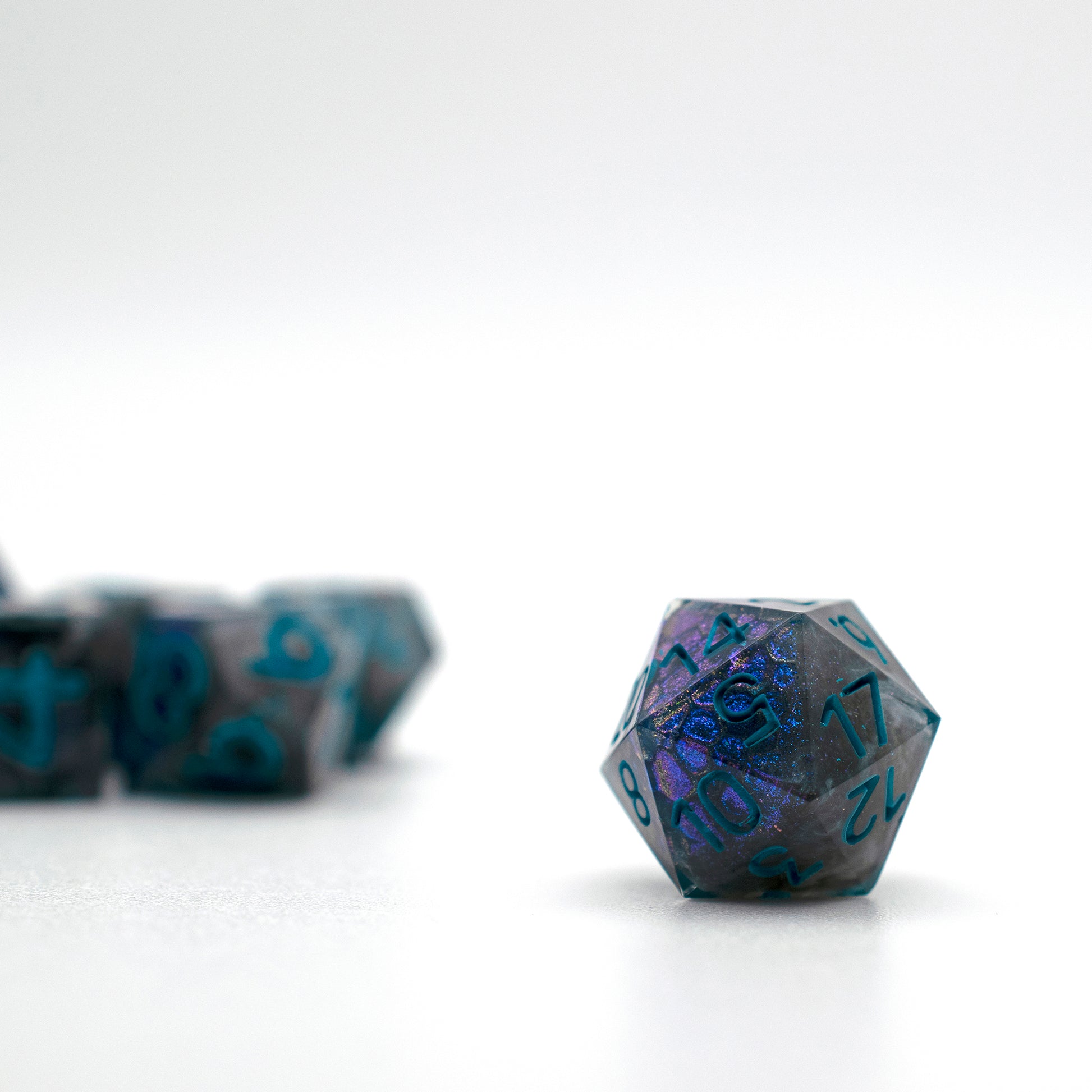 These dice have black cores with swirls of grey and sparkles, patches of dragon scale pattern on the outside of the core shimmers an iridescent blue hue. These dice would be great for a draconic bloodline sorcerer or a dragonborn character.