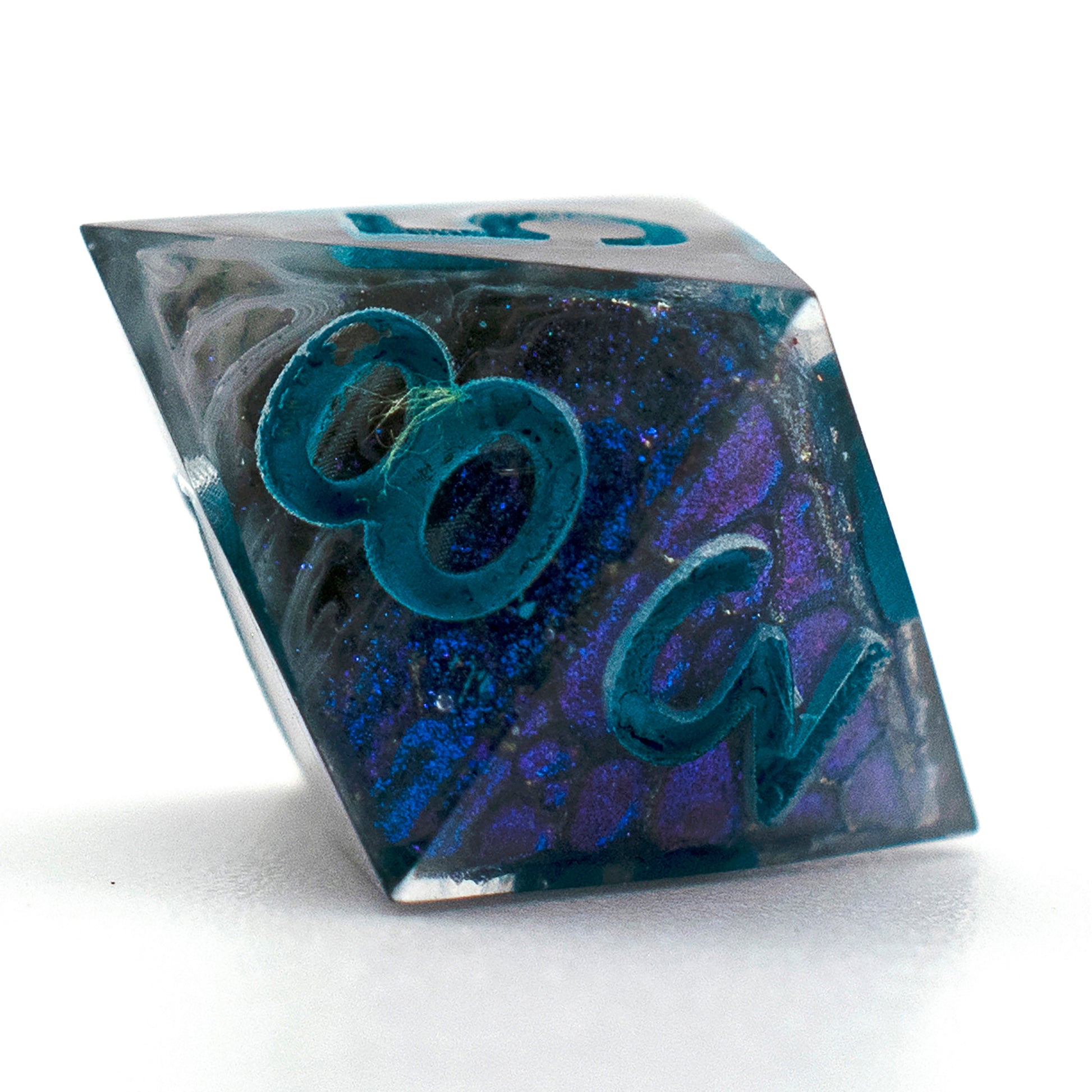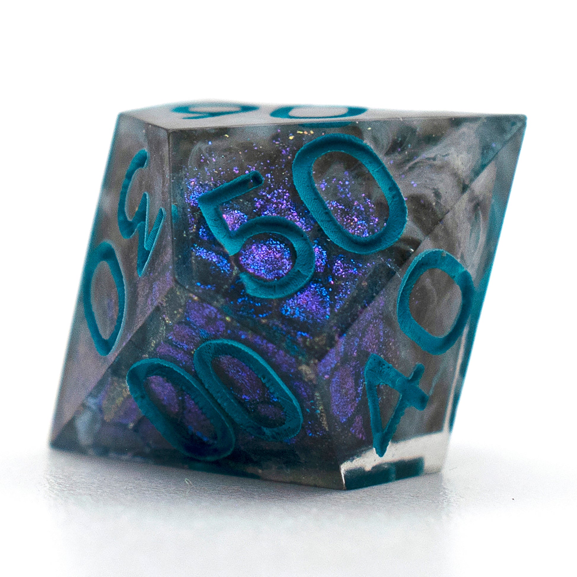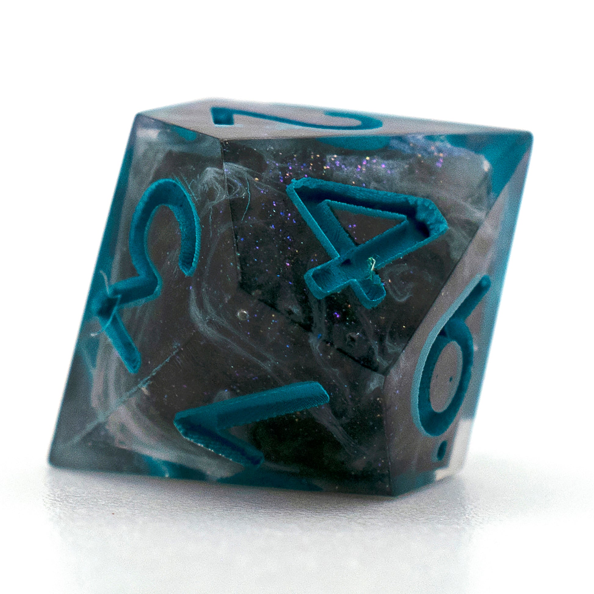 These dice have black cores with swirls of grey and sparkles, patches of dragon scale pattern on the outside of the core shimmers an iridescent blue hue. These dice would be great for a draconic bloodline sorcerer or a dragonborn character.