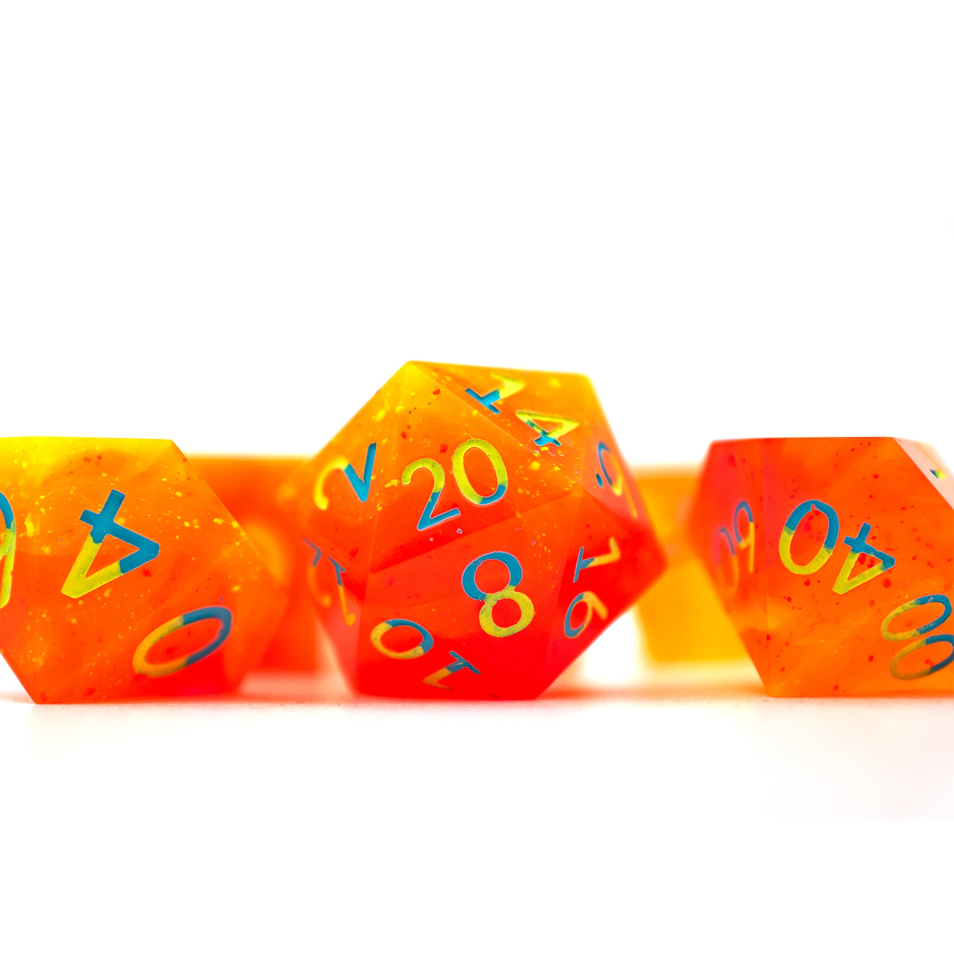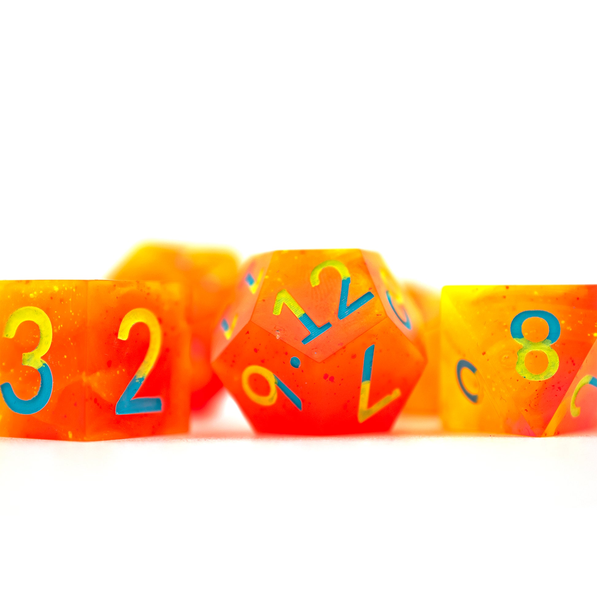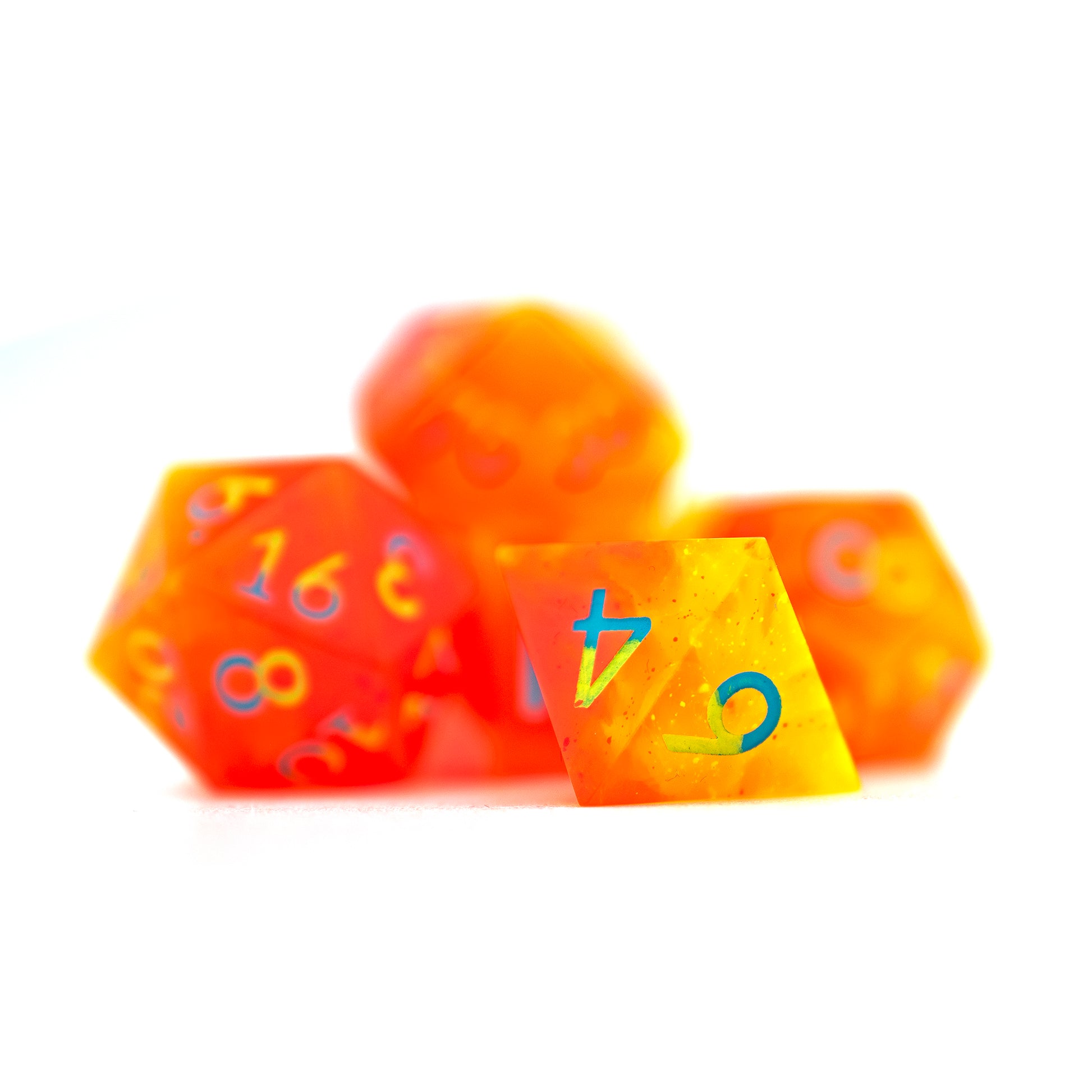 Each set of dice are handcrafted: cast in resin, sanded, painted, and polished to a gleam. This means each set is unique, and may have minor cosmetic imperfections that won’t impact their functionality. We will not accept any returns due to these imperfections. This set of dice consists of 7 pieces, one of each of the following: D20, D12, D10, D%, D8, D6, D4.