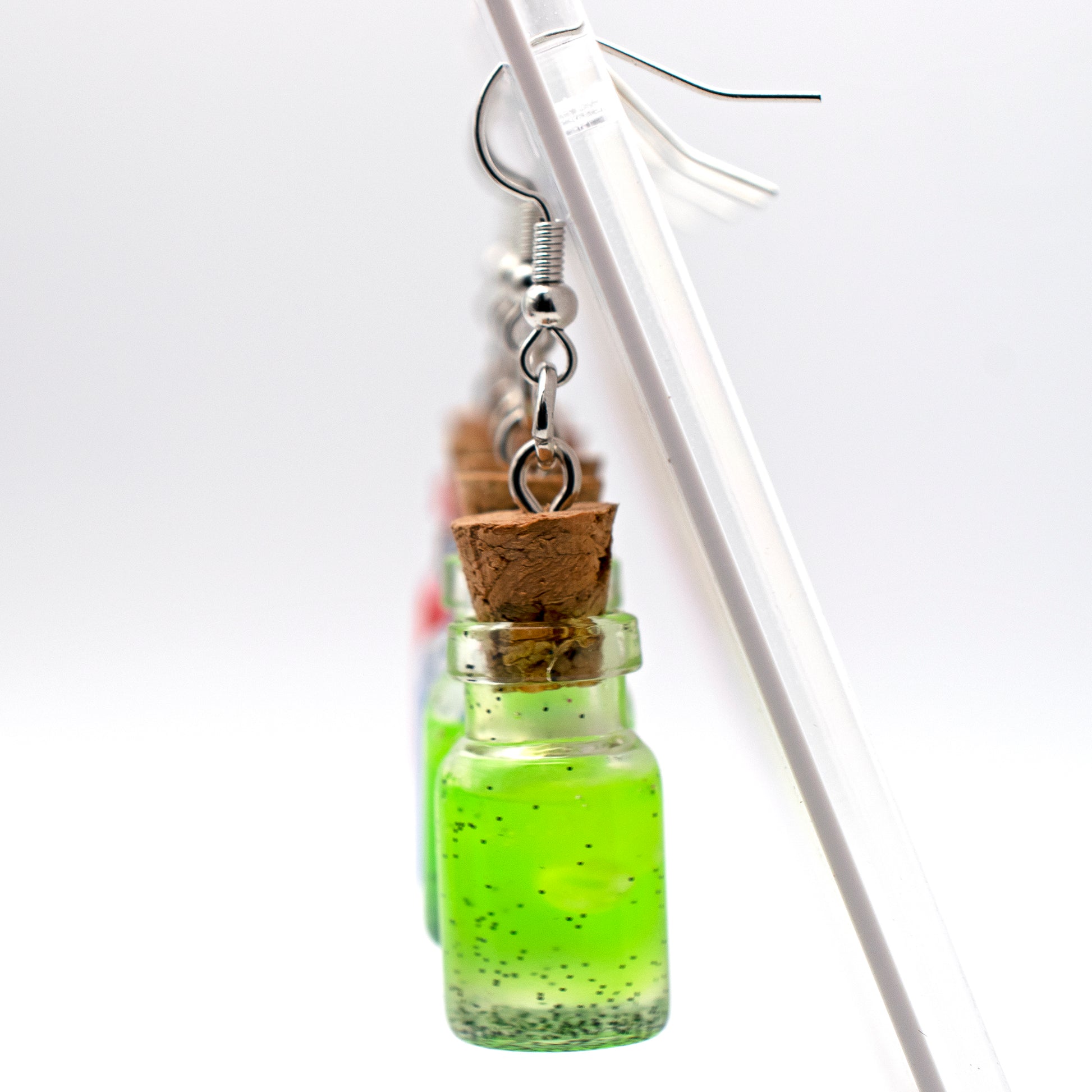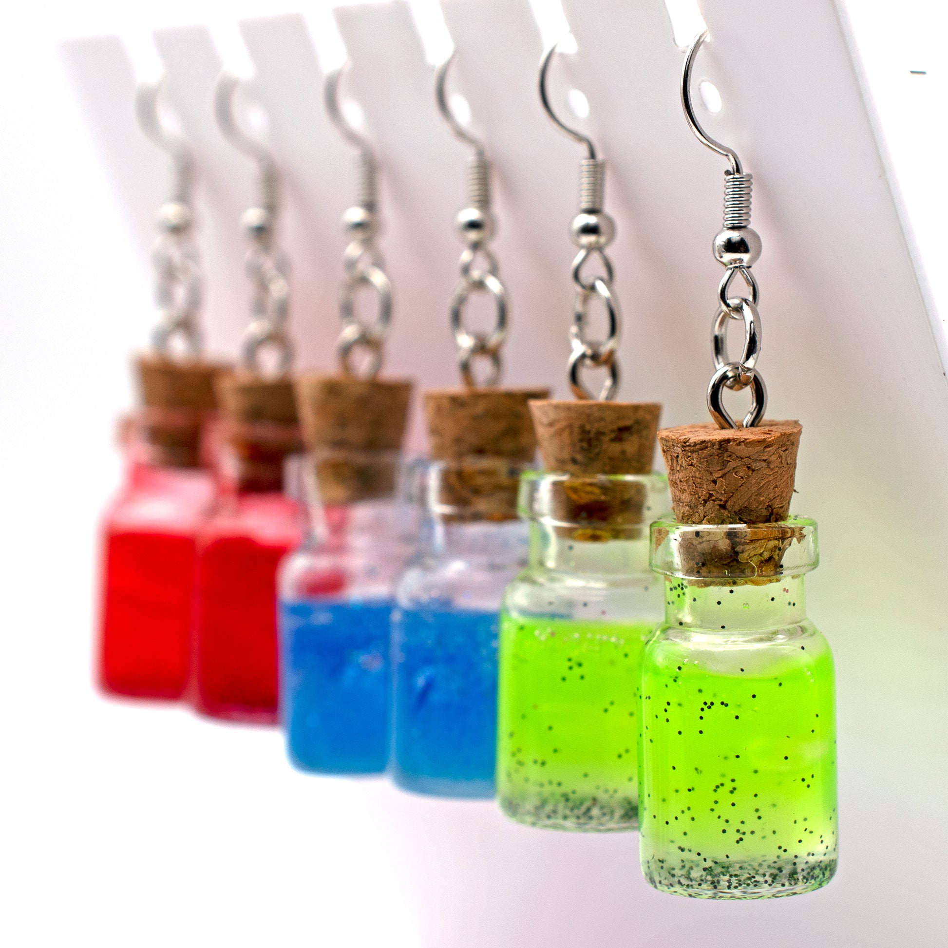 Glass bottles filled with sparkly goodness, on hypoallergenic stainless steel or 925 sterling silver plated hooks. This listing is for a mystery set of potion earrings. Potion earrings sent are based on current colors in stock, and we cannot guarantee the color of the potion earrings. Photographs are of some example colors, the set received may not be of a color shown. All potions are crafted in house, and colors vary.