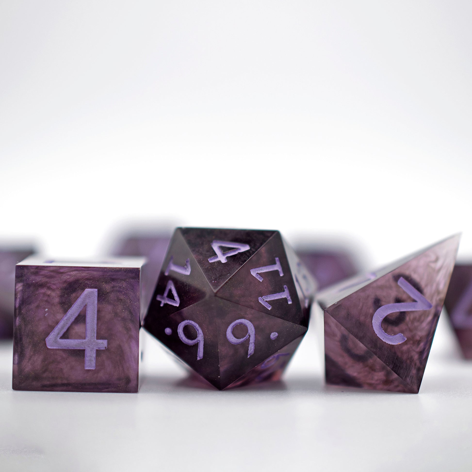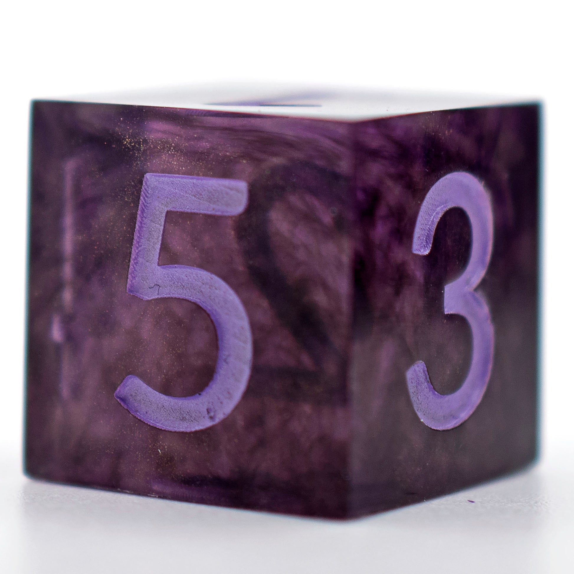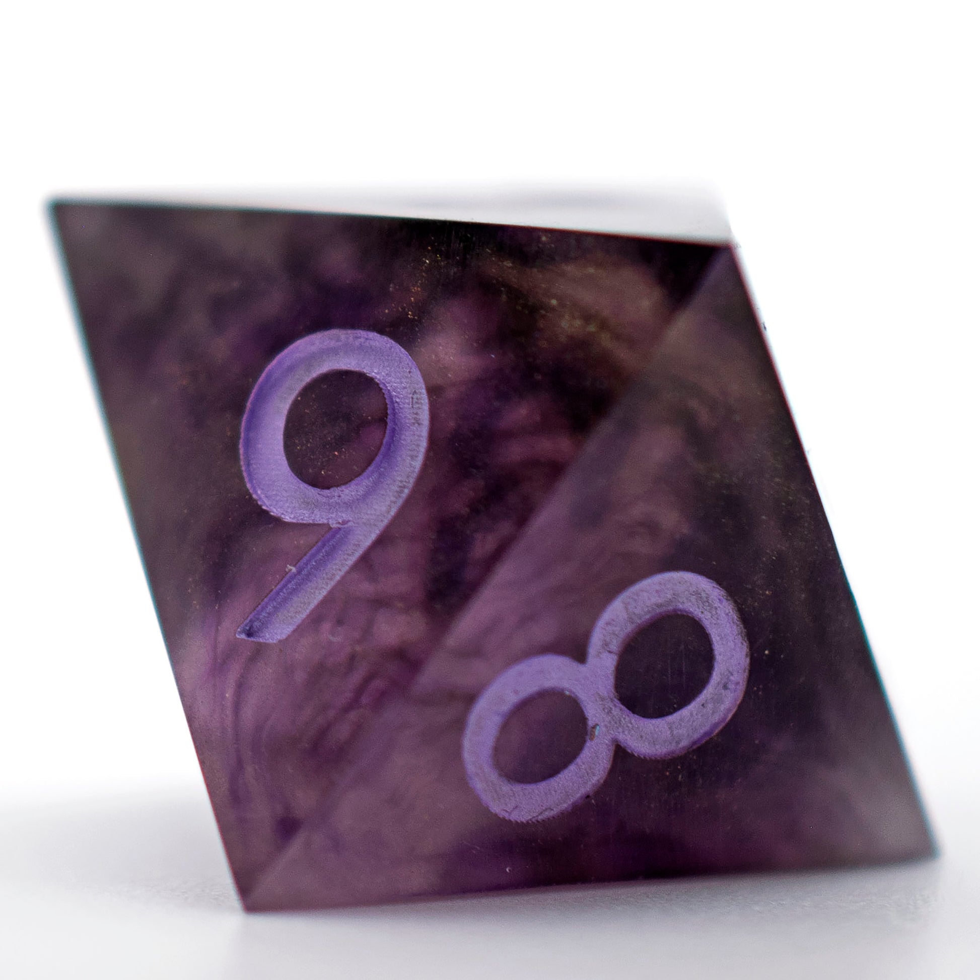 Lady Shar dice feature deep purple resin with captivating swirls of gold, evoking the mesmerizing beauty of the darkness that our lady presides over.