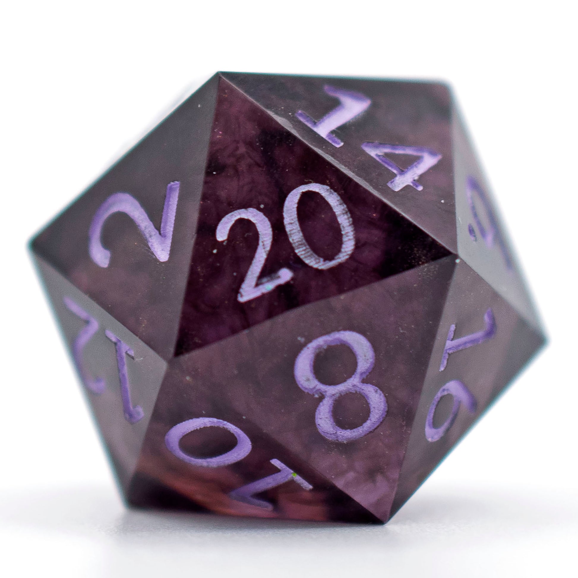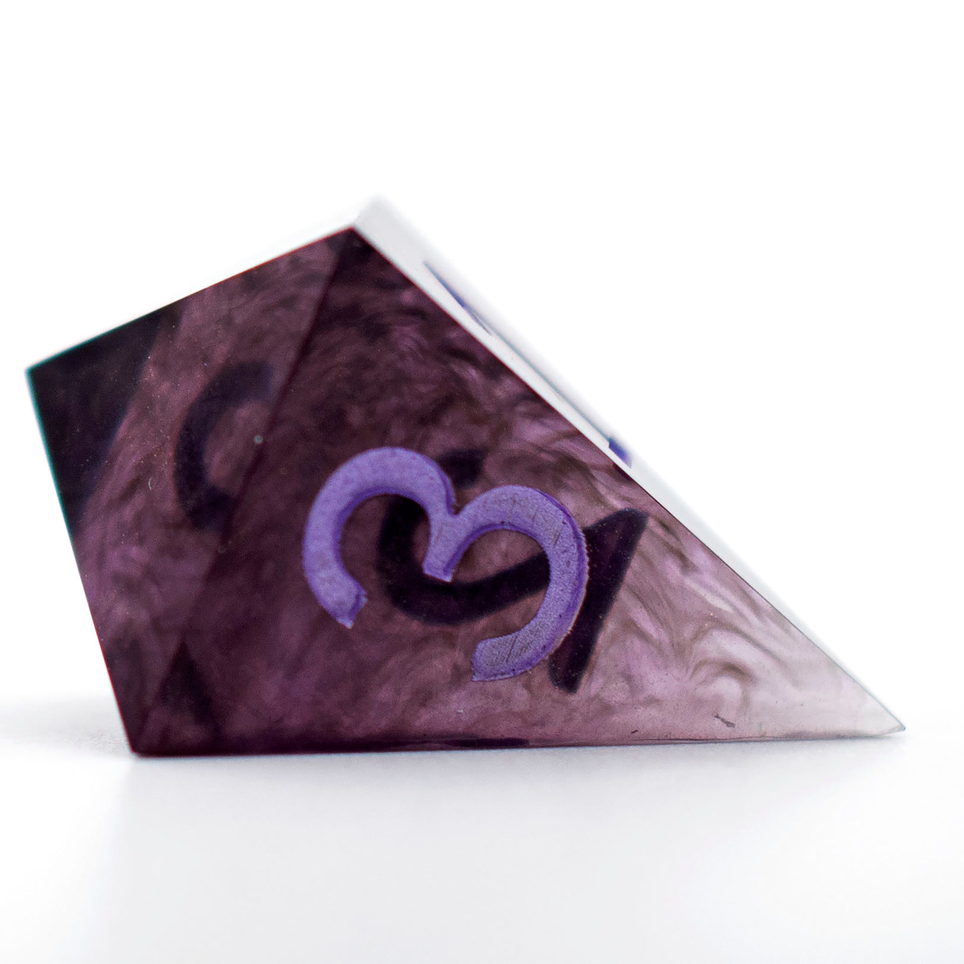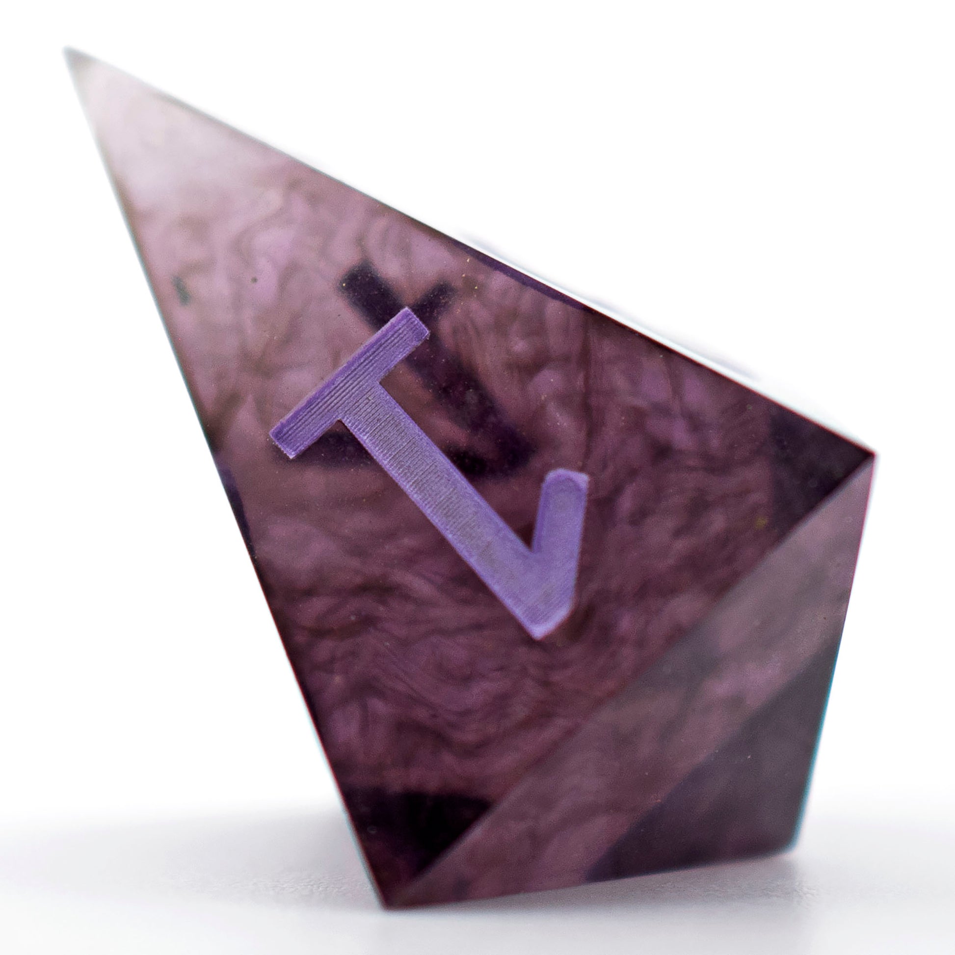 Lady Shar dice feature deep purple resin with captivating swirls of gold, evoking the mesmerizing beauty of the darkness that our lady presides over.