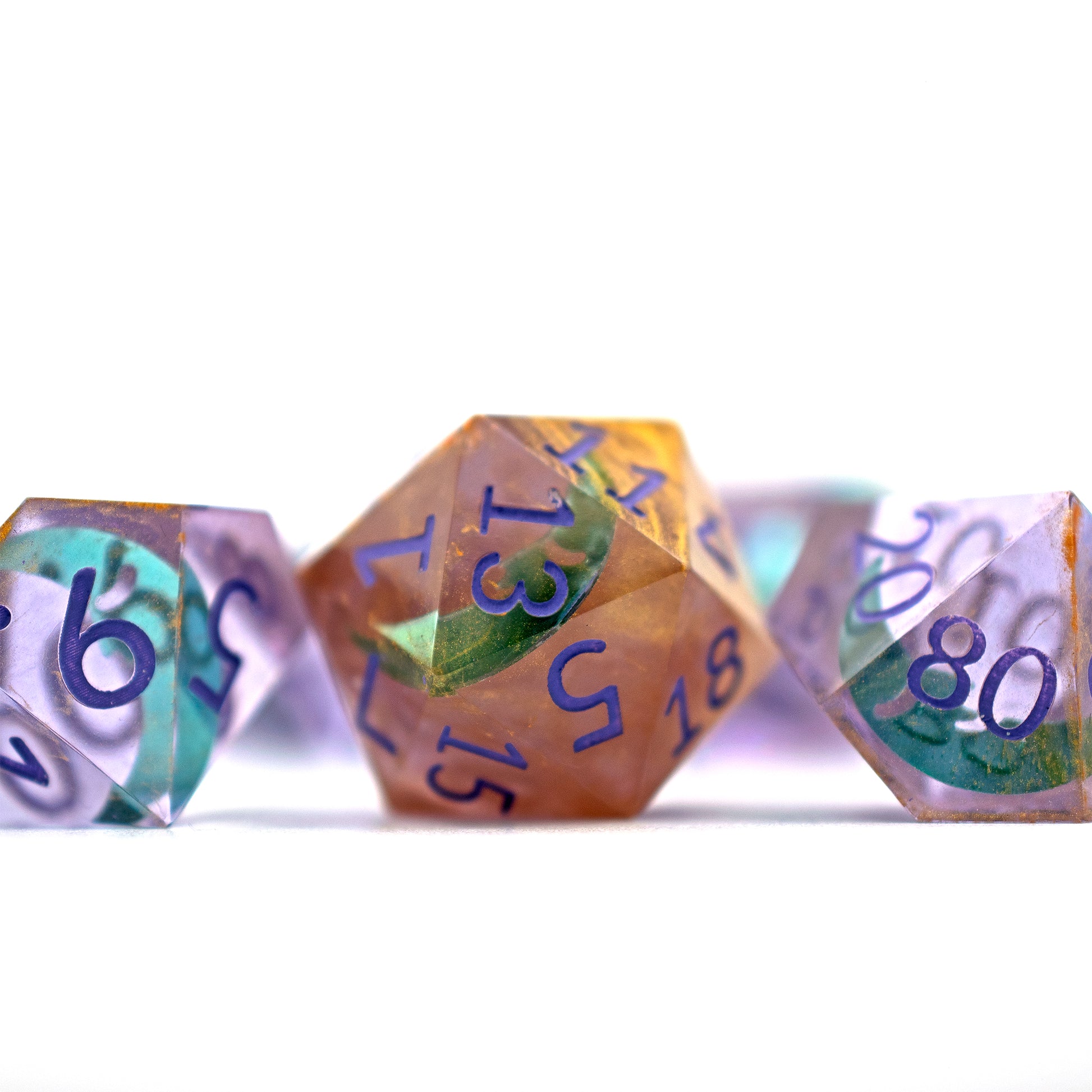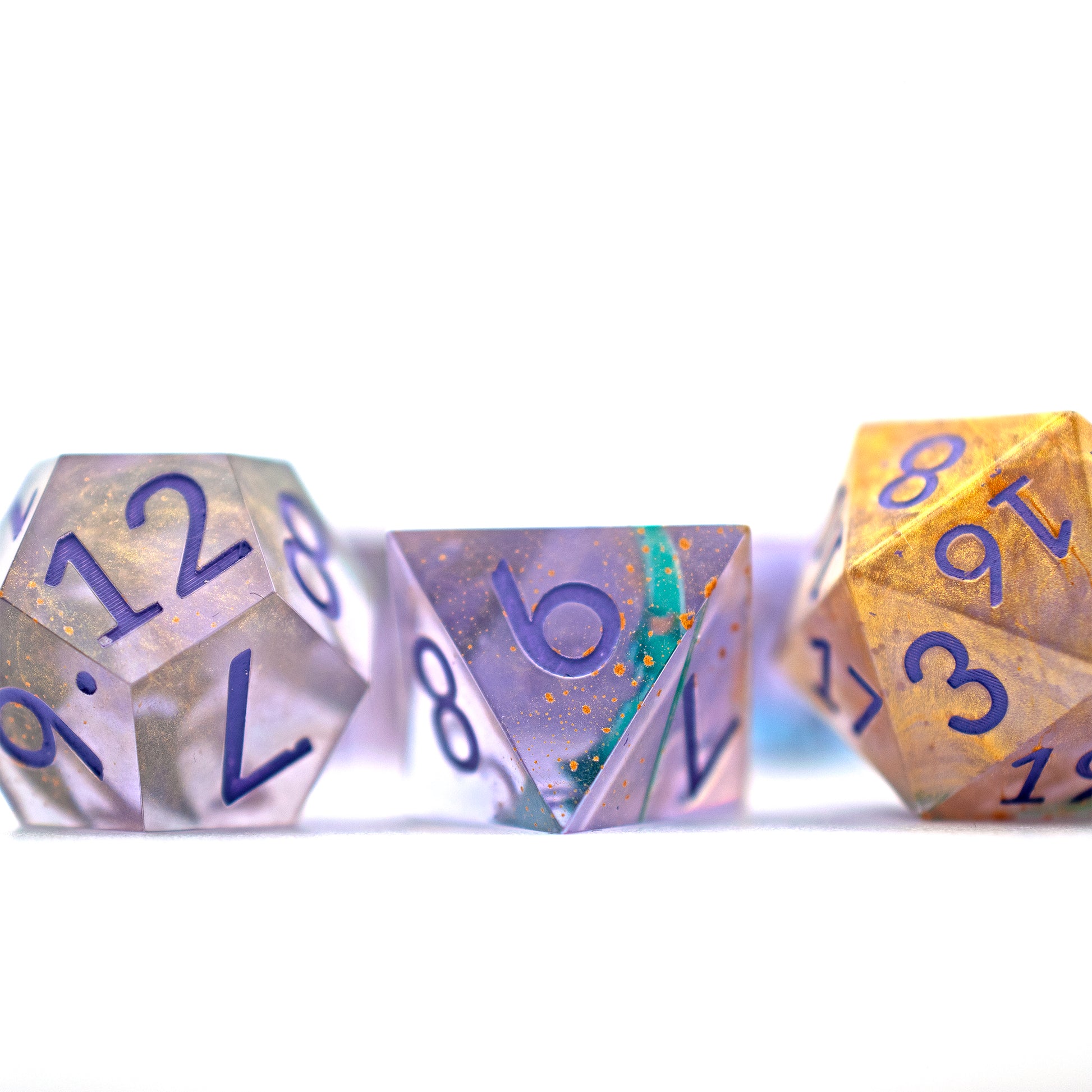 Each set of dice are handcrafted: cast in resin, sanded, painted, and polished to a gleam. This means each set is unique, and may have minor cosmetic imperfections that won’t impact their functionality. We will not accept any returns due to these imperfections. This set of dice consists of 7 pieces, one of each of the following: D20, D12, D10, D%, D8, D6, D4.