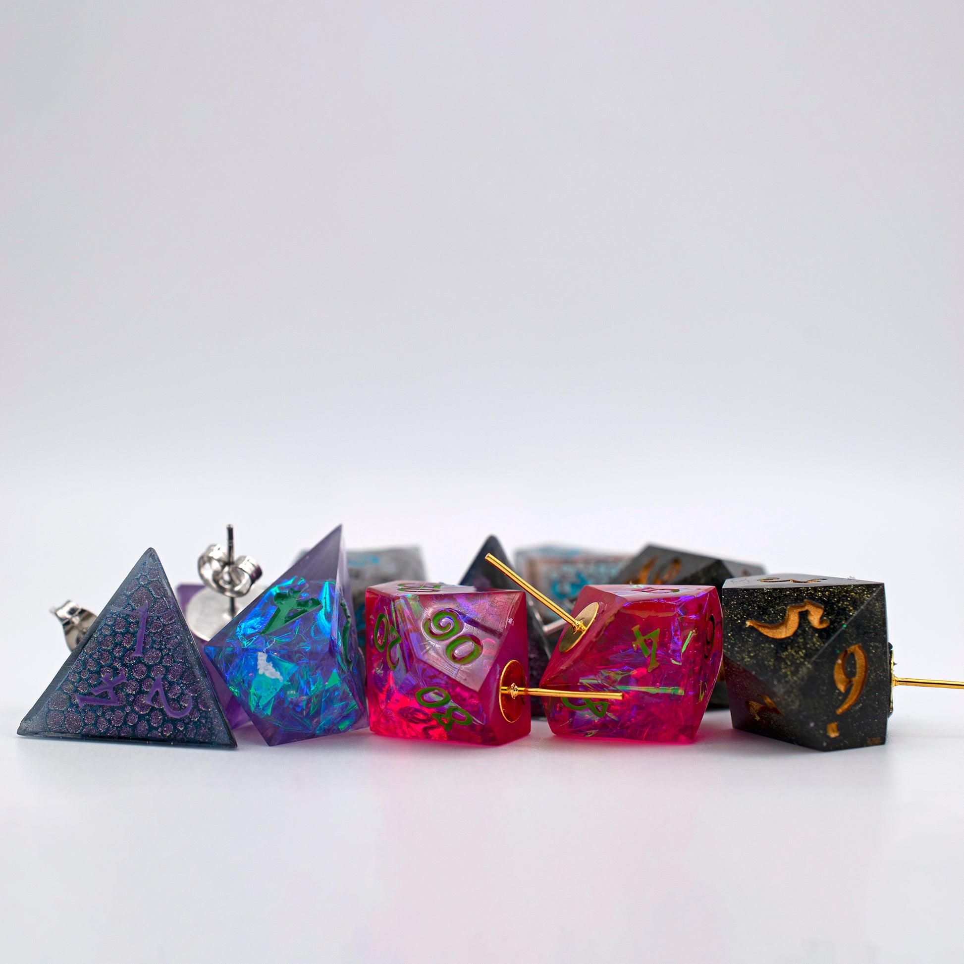 These dice earrings are capped with two dice, polished to a gleam. This listing offers a single pair of earrings crafted from mystery artisan dice. Our mystery dice jewelry includes both standard and mini-sized dice. Please note that we cannot guarantee specific color or size.