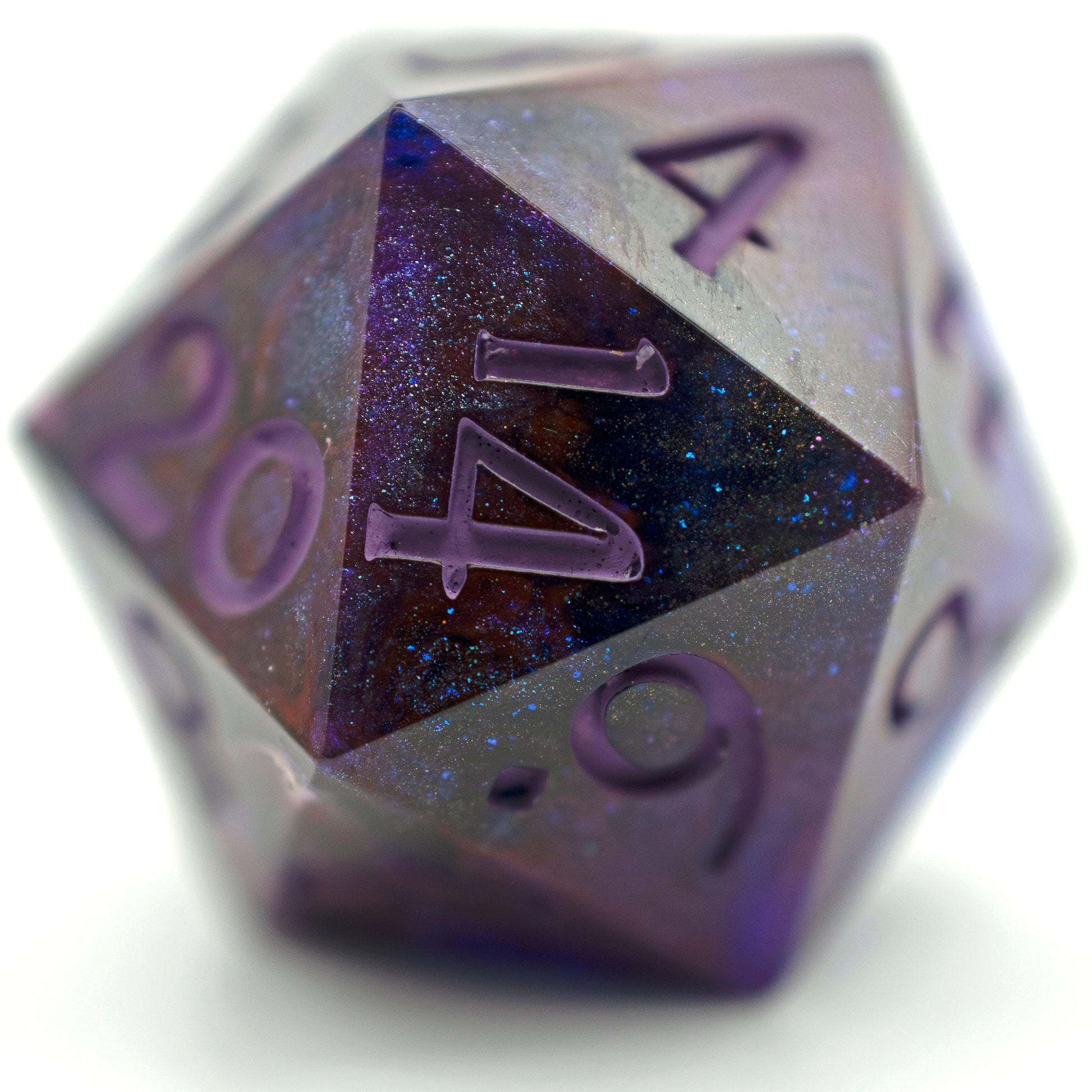 An oversized 34mm die cast and finished by hand. This is a listing for a mystery dice of this size, we cannot guarantee color or design. They may have a scuff here or a speck there, but these hefty lads still roll like champions.