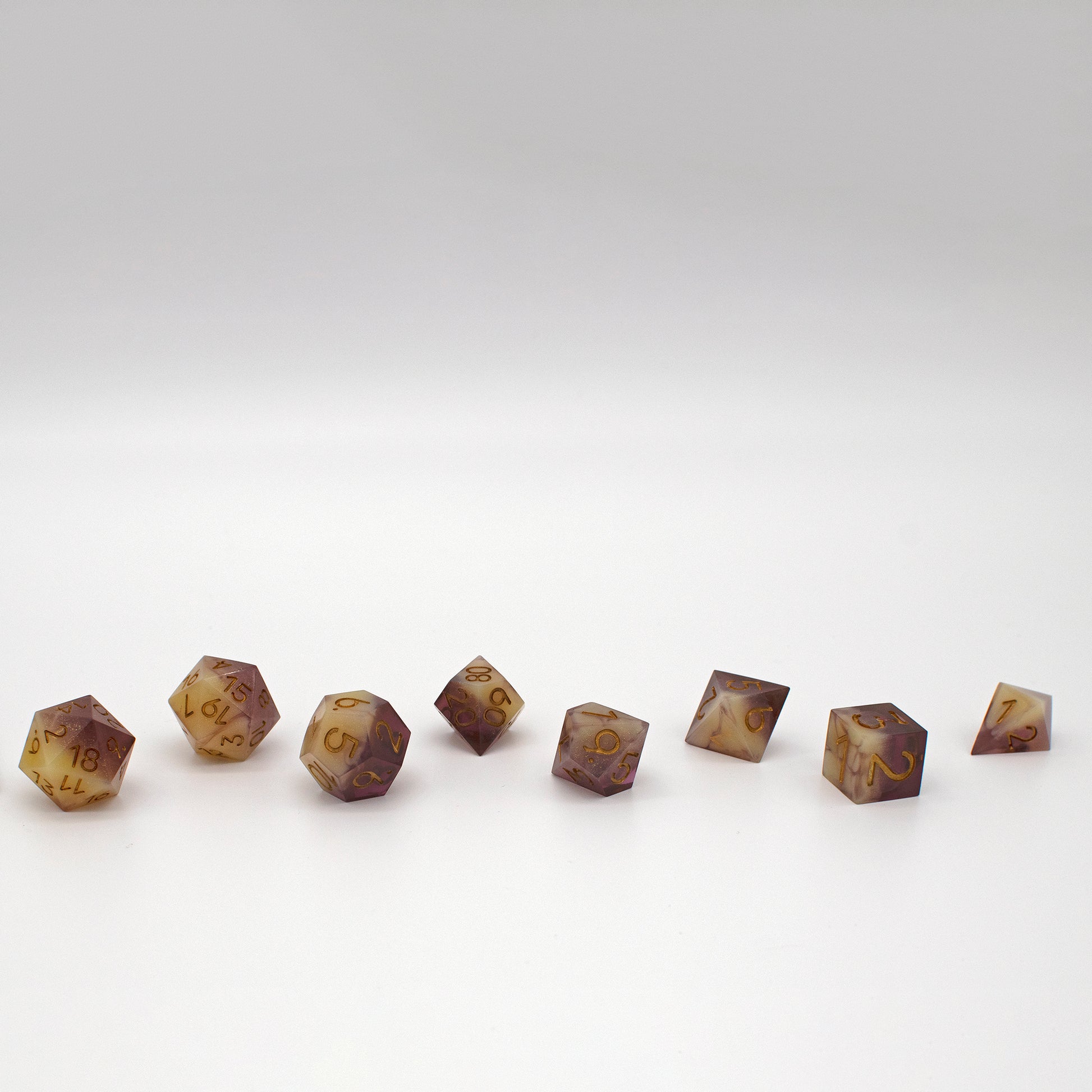 Each set of dice are handcrafted: cast in resin, sanded, painted, and polished to a gleam. This means each set is unique, and may have minor cosmetic imperfections that won’t impact their functionality. We will not accept any returns due to these imperfections. A set of dice consists of 7 pieces, one of each of the following: D20, D12, D10, D%, D8, D6, and D4.