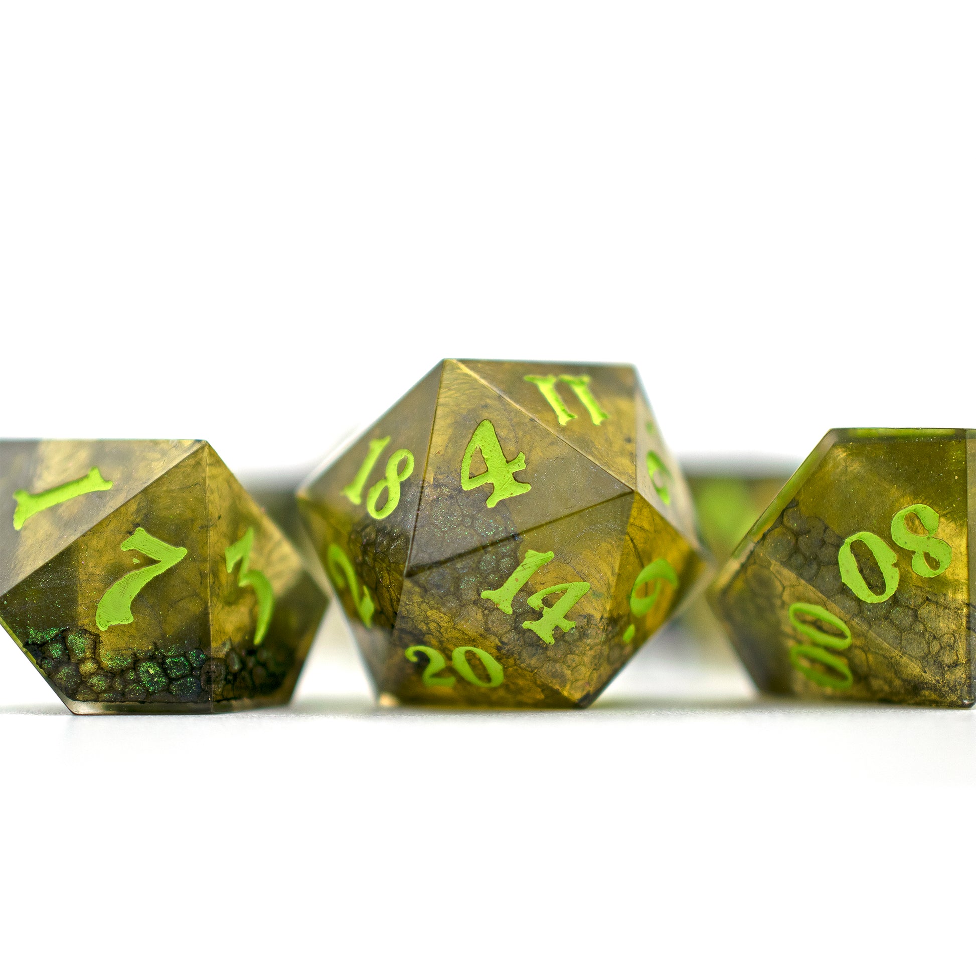 Each set of dice are handcrafted: cast in resin, sanded, painted, and polished to a gleam. This means each set is unique, and may have minor cosmetic imperfections that won’t impact their functionality. We will not accept any returns due to these imperfections. This set of dice consists of 7 pieces, one of each of the following: D20, D12, D10, D%, D8, D6, D4.