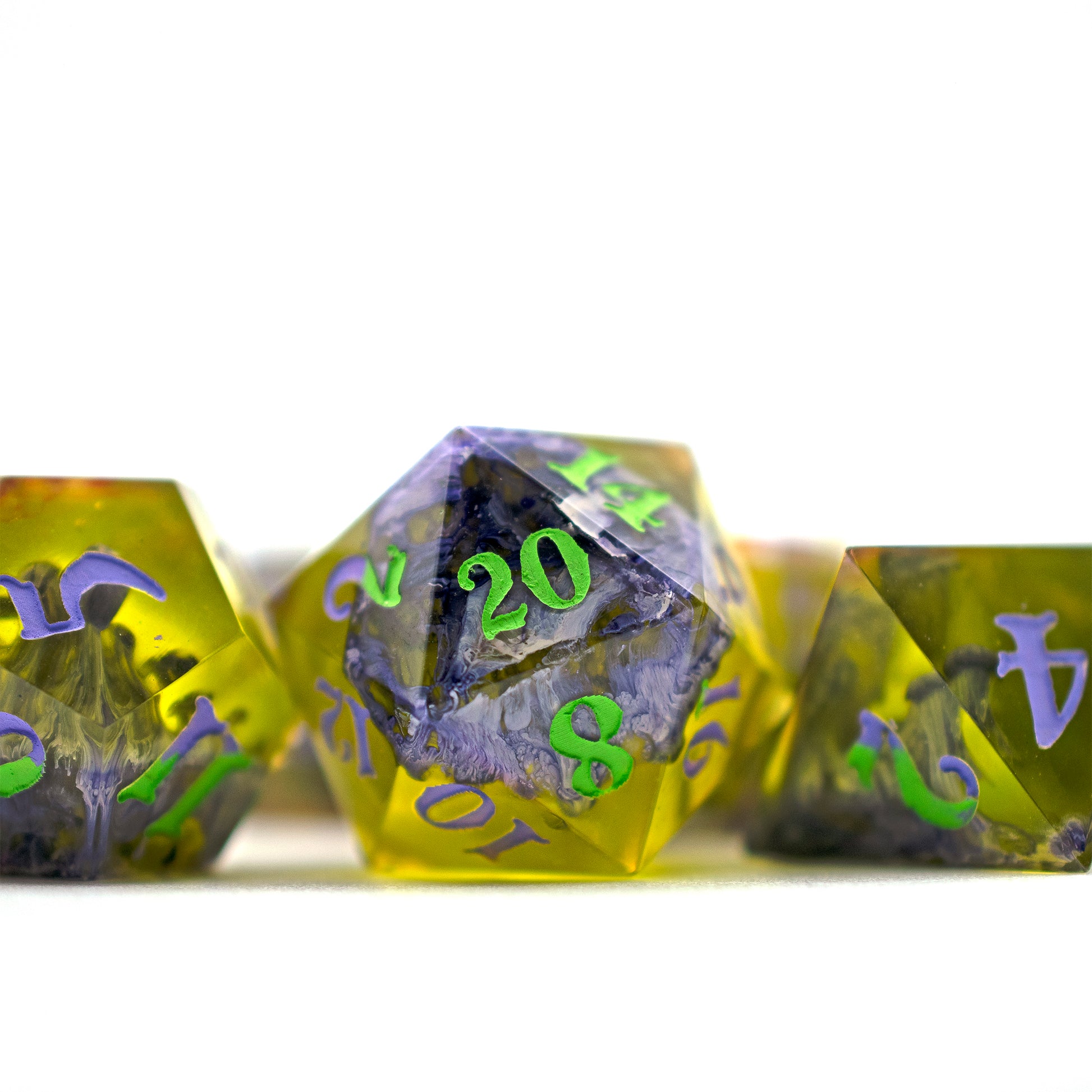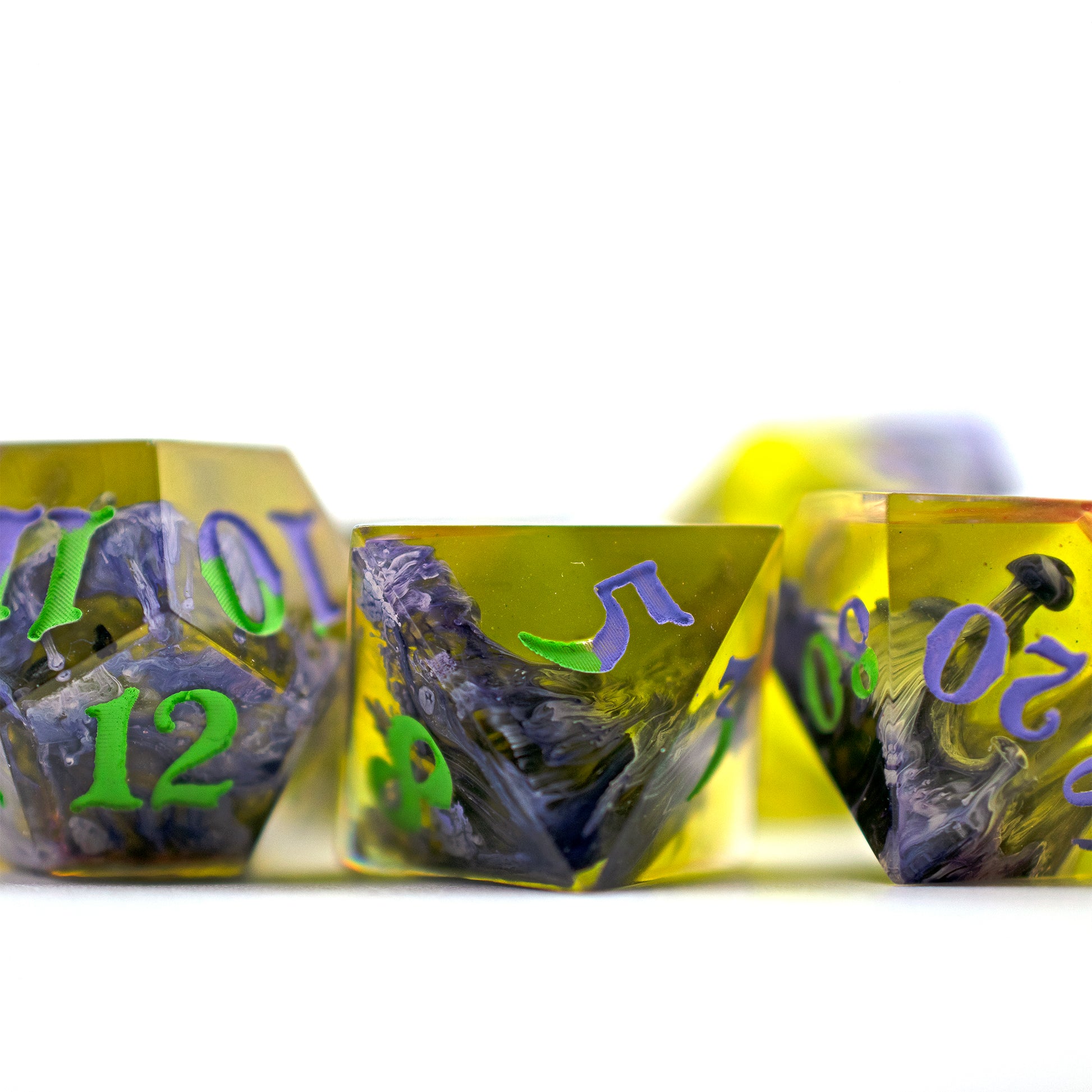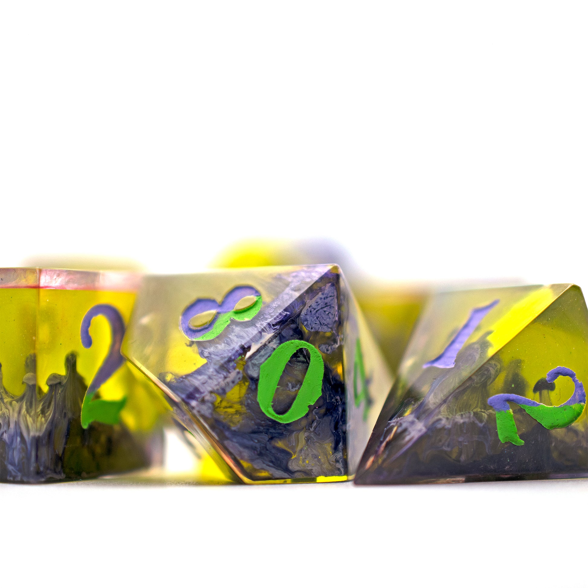 Each set of dice are handcrafted: cast in resin, sanded, painted, and polished to a gleam. This means each set is unique, and may have minor cosmetic imperfections that won’t impact their functionality. We will not accept any returns due to these imperfections. This set of dice consists of 7 pieces, one of each of the following: D20, D12, D10, D%, D8, D6, D4.