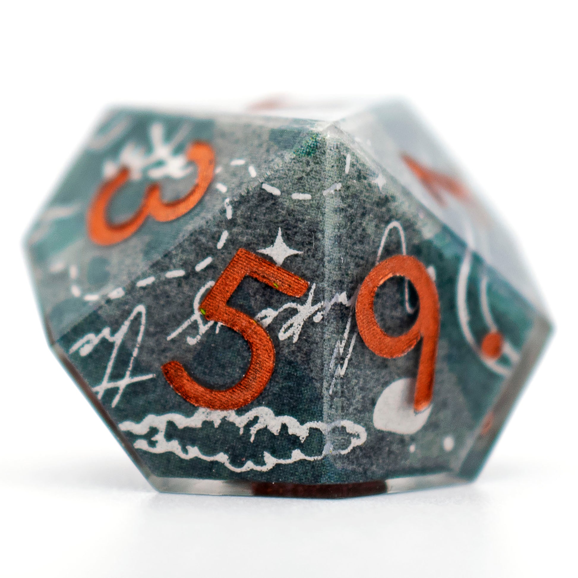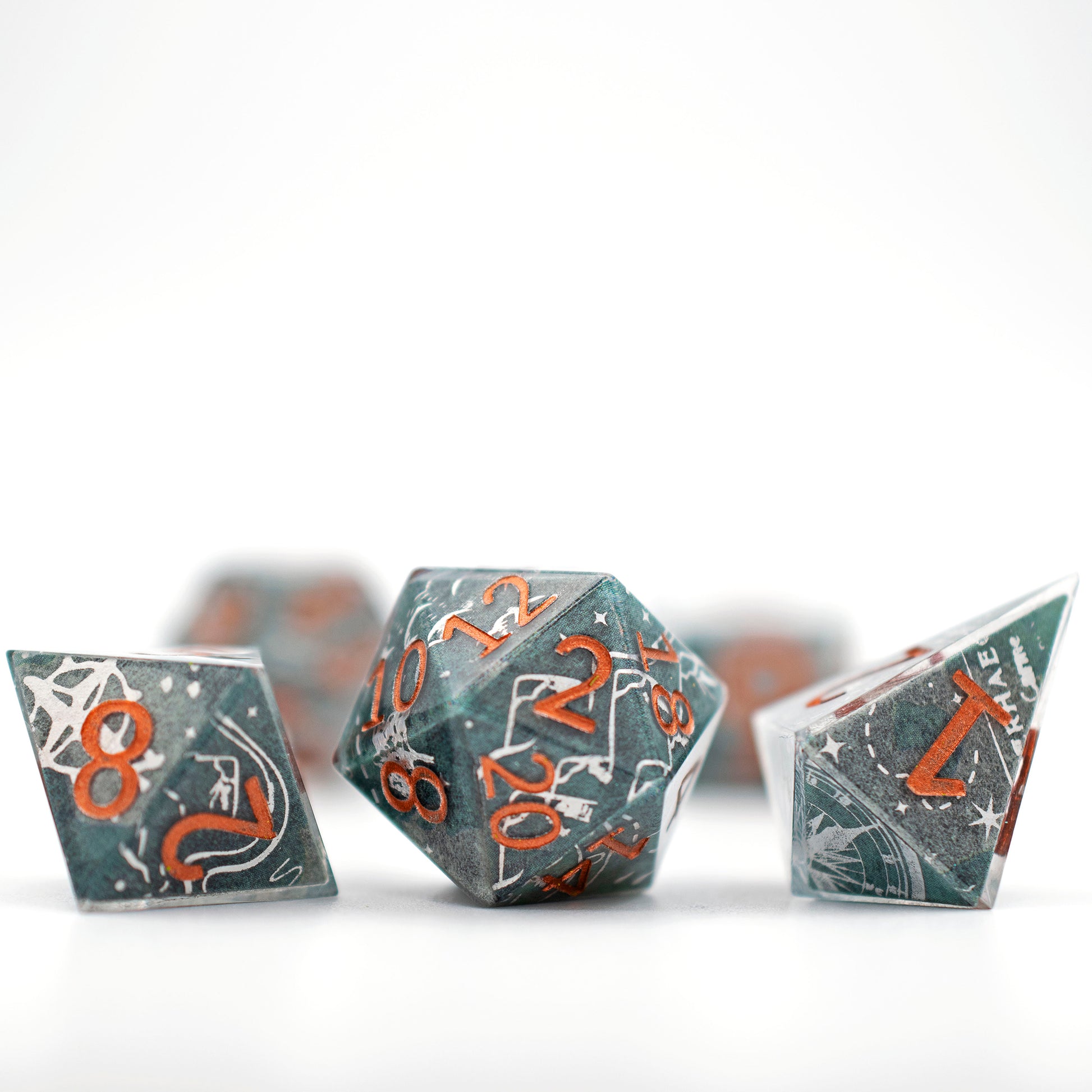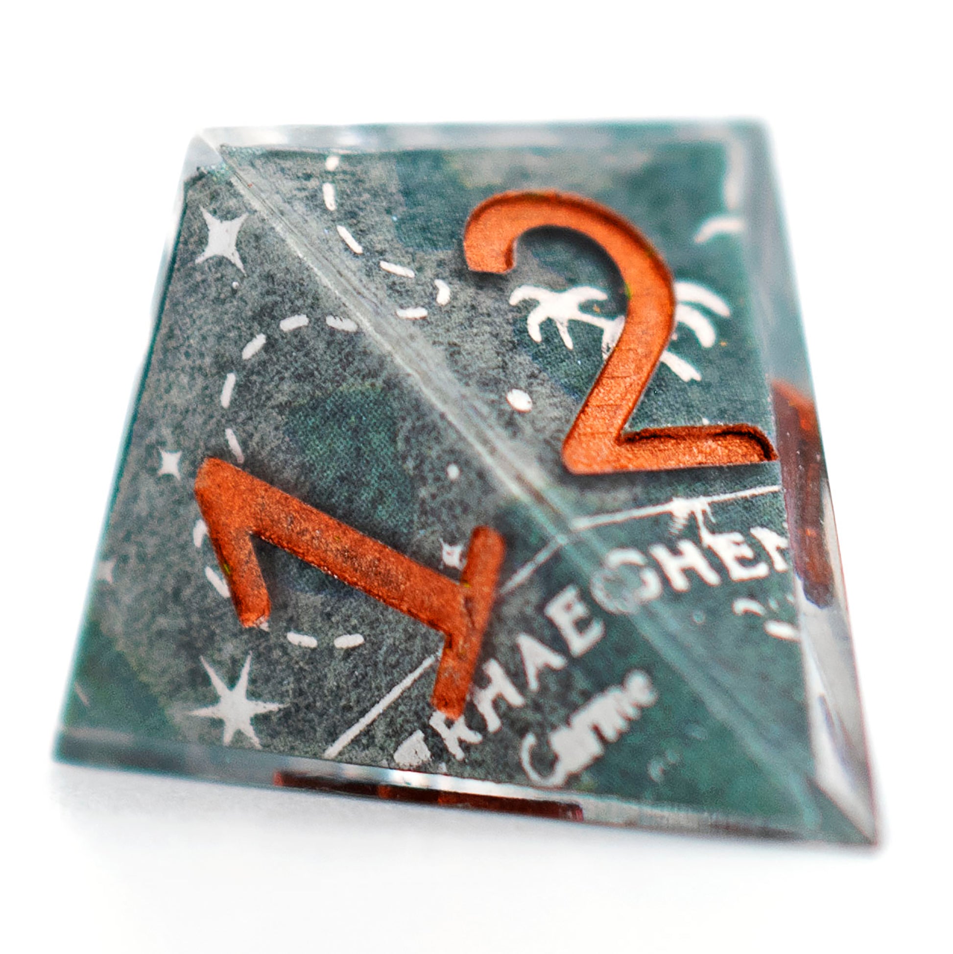 Wrapped in a map adorned with iridescent silver markings, the cores of these dice are interesting from every angle. The copper inked numbers are reminiscent of a compass rose on the dark green field of the map.